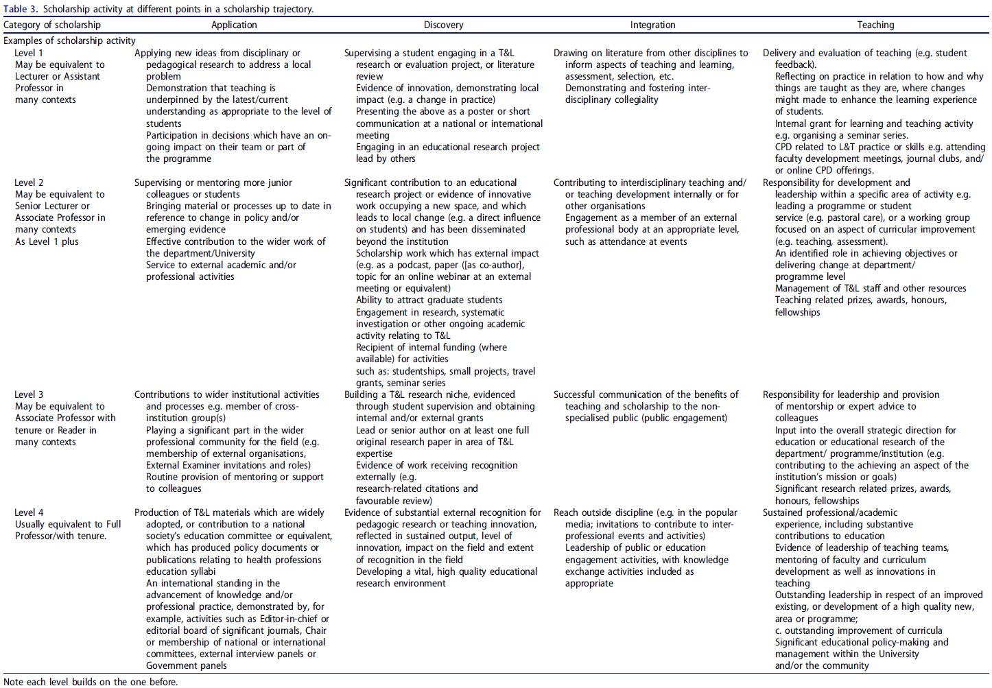 학술활동scholarship은 특정분야의 연구가 아니라 자체적인 장점으로 판단해야 하고, P&T 실무는 교수들의 업무패턴을 반영해야 한다. 이를 설명하기 위해, 우리는 학술활동 궤적의 서로 다른 지점에서 기대할 수 있는 학술활동 활동의 종류에 대한 몇 가지 실질적인 팁을 제공한다(표 3). 이 표에는 개인이 한 단계에서 다른 단계로 이동해야 한다거나, 광범위한 학술 활동을 수행하기를 원하거나 필요로 한다는 가정이 없다(예: 표 2 참조).