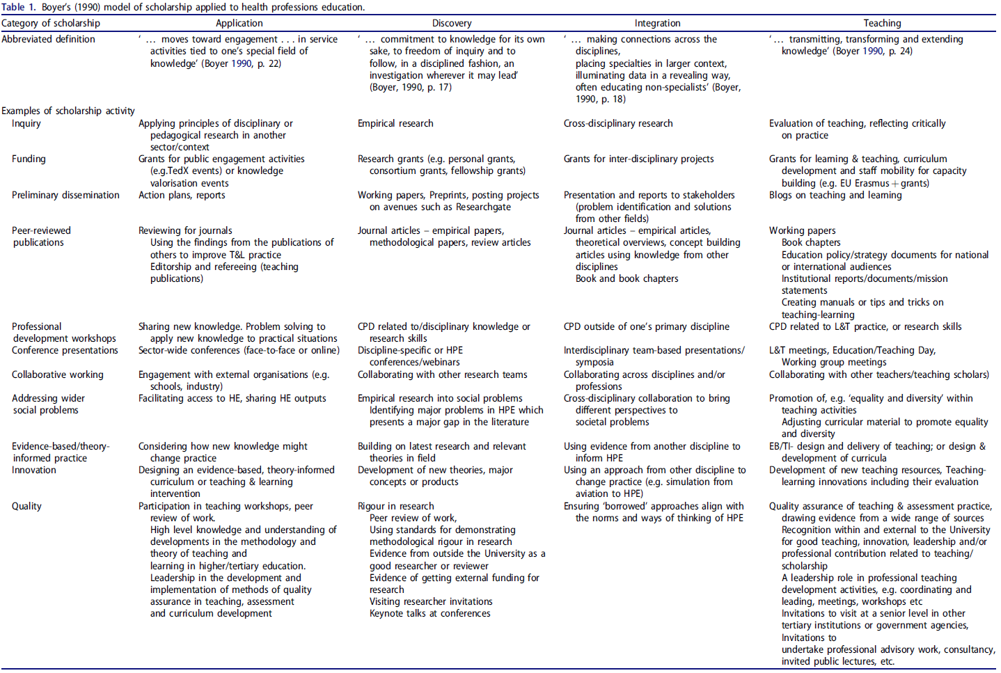 Table 1. Boyer’s (1990) model of scholarship applied to health professions education.