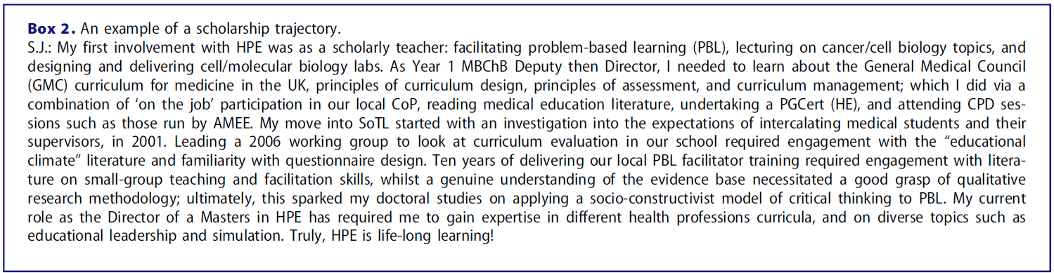 Central to our understanding of scholarship is that where one starts in the HPE scholarship trajectory is linked to the experience and expertise that one brings into the educational space from one’s primary discipline. While those trained initially as educationalists are relatively rare in health professions education, many colleagues who become involved in educational scholarship were originally trained as medical doctors, psychologists, cognitive or biomedical scientists, etc. We are a diverse group.