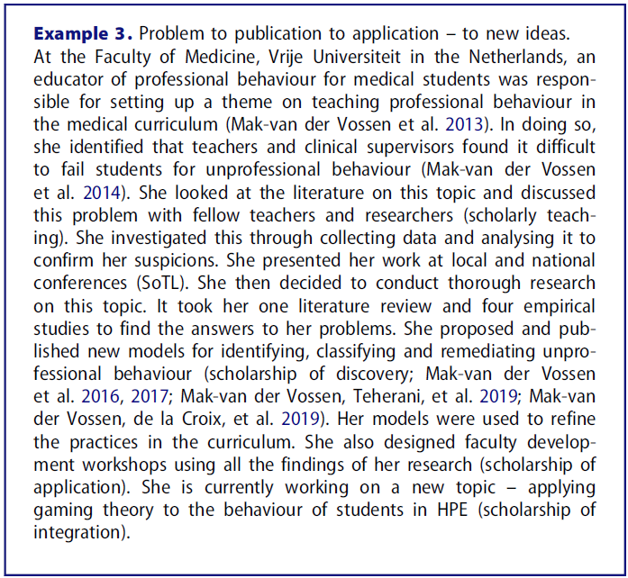In presenting Table 1 with dotted lines between adjacent columns, we intend to make the point that individual health professions educators may not be restricted to – or indeed recognise – distinct manifestations of scholarship. Rather, they may find that some of their scholarly activities align with one or more of Boyer’s scholarships.