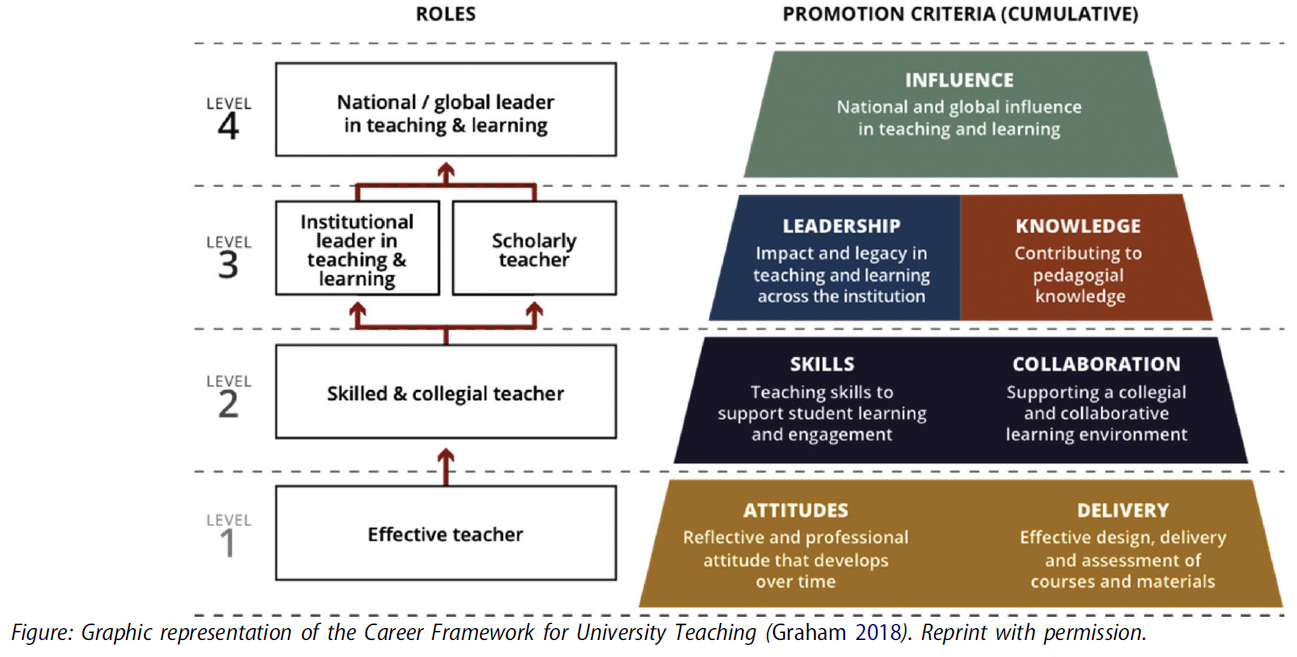 문헌에서는 교육에 긍정적인 제도적 문화를 확립하는 데 있어 교사의 역할에 대한 공식적인 인정과 보상의 가치를 지적하지만, 많은 대학에서 teaching credentials는 승진의 근거로 이용되지 않거나 약하게 이용된다(Kumar et al. 2011; Paslawski et al. 2013; Steinert and Macdonald 2015). 경력 프레임워크는 교사 ID를 검증하는 데 도움이 된다(Kumar와 Greenhill 2016). 진로 프레임워크는 교사와 감독관이 교사 성과를 더 잘 인식하고 교사의 발전을 반영할 수 있도록 한다. 여러 저자들은 이러한 프레임워크가 전달뿐만 아니라 설계, 평가, 관리/리더십, 장학금 및 자신의 전문성 개발 등 교직 역할의 전폭을 다루어야 한다는 것을 보여준다(Graham 2018; Harden and Lilley 2018). 교육을 인식하기 위한 공식적인 정책이 실제로 적용되는 것이 중요하다. 그렇지 않으면 원래 의도와 배치되거나 훼손되는 숨겨진 메시지를 전달할 위험이 있다(Cox 외 2011; Hafler 외 2011).