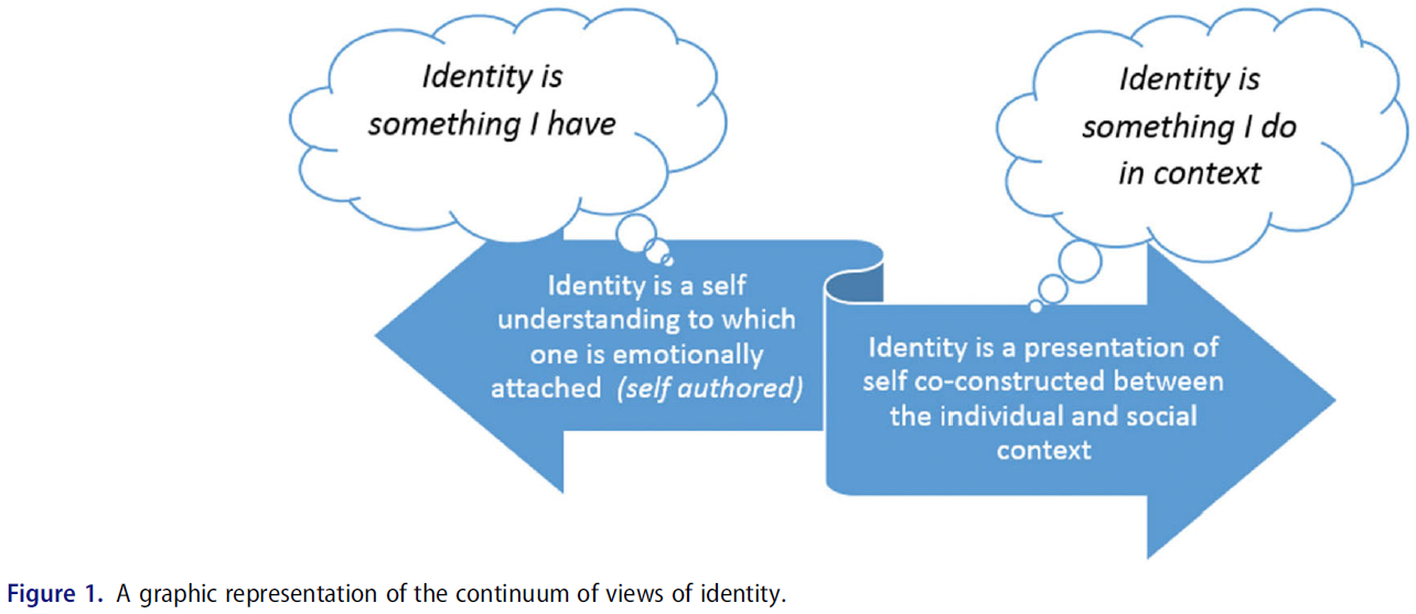 우리가 보기에, 정체성은 두 가지를 모두 포함한다. 정체성은 [한 사람과 그들의 사회적 환경 사이의 끊임없는 대화 속에서 형성되고 재편된 자신에 대한 이해이자 표현]으로 볼 수 있다(그림 1).