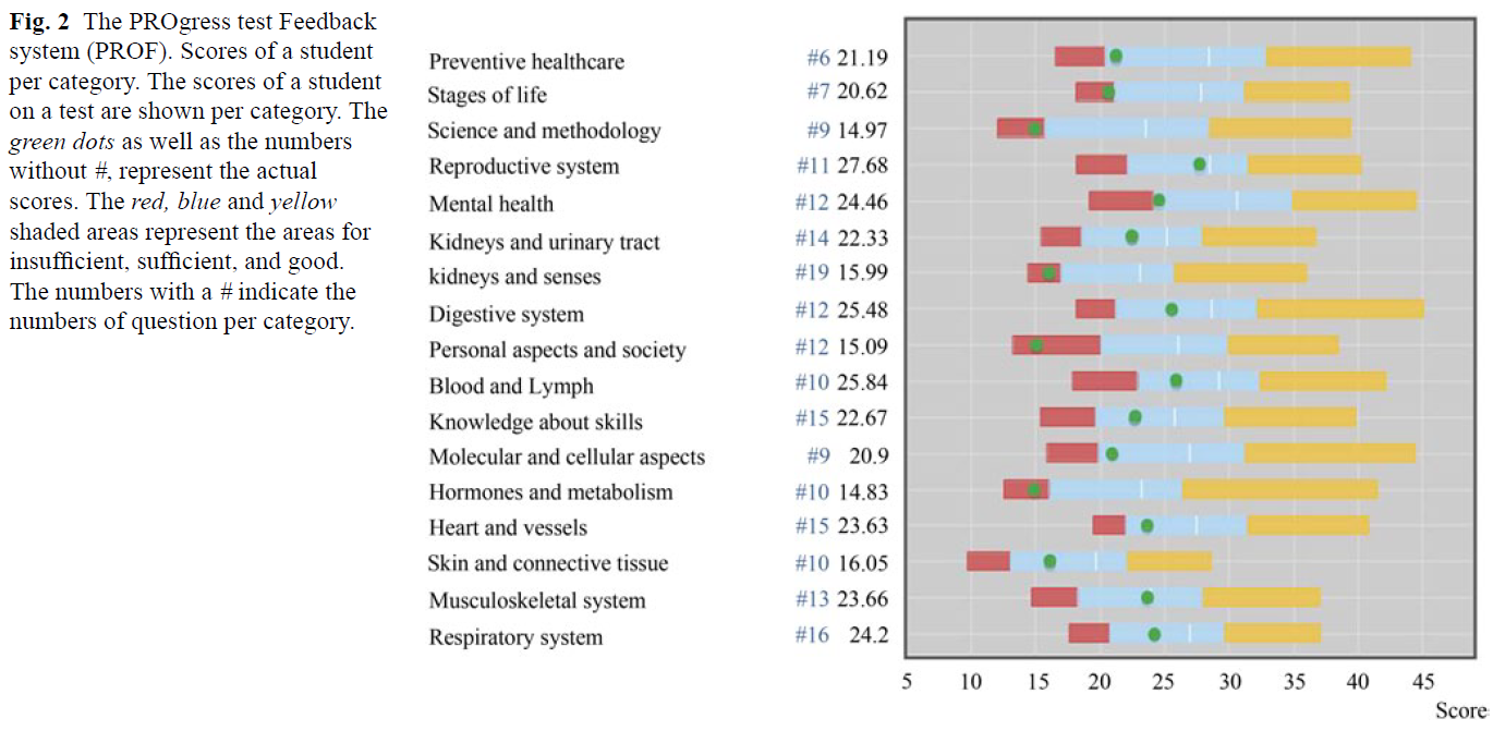 평가가 학습을 추진한다는 가정은 교육에서 널리 받아들여지는 도그마이다 [4, 14–17]. 각 발달시험의 항목은 고정 2차원 행렬(표 1)에 따라 분포되어 있다. 각 시험 후 학생들은 시험지를 가지고 갈 수 있으며, 정답 키는 곧 출판된다. 이렇게 하면 답변을 확인하고 부족한 점을 식별할 수 있습니다. 분기별 테스트의 항목 분포는 동일하므로 다음 테스트에서 특정 하위 범주의 점수를 향상시킬 수 있습니다. 또한 PROgress test Feedback system 'PROF'라는 온라인 피드백 시스템을 구축하였다(그림 1과 그림 2). 이 시스템을 통해 학생들은 전체 점수(그림 1)와 부문별 점수(그림 2)에 대한 이해를 얻을 수 있으며, 자신의 점수를 동료 그룹, 시험 모멘트 당 평균과 비교할 수 있다[18]. 이 지속적이고 반복적인 테스트와 피드백의 맥락에서, 우리는 학생들이 그들의 결함을 복구하도록 자극하는 강력한 도구를 구성했다. PROF 시스템의 높은 사용 또한 높은 지식 증가와 관련이 있었다(Donkers et al., 출판용으로 제출된 Donkers et al.) [19]. 이러한 맥락에서 발달시험은 지식 성장을 감시하는 형태 형성적 평가 도구로도 사용할 수 있는 귀중한 도구라는 점을 언급하는 것이 중요하다[20].