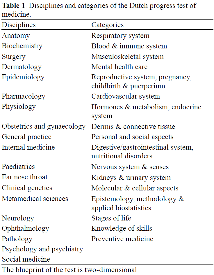 네덜란드에 발달시험이 처음 도입된 이후 많은 것이 바뀌었다. 처음에, 8개의 의과대학 중 단 한 곳만이 그것을 사용했다. 1990년대 이후 이 숫자는 급격히 증가하여 현재 5개 학교가 네덜란드 발달시험에 참여하고 있으며, 2015-2016학년도에 6번째 학교가 시작될 것이다. 이는 만 명 이상의 학생들이 동시에 시험을 치르는 것을 의미한다. 우리는 지역 물류와 지역 및 국경일을 고려하여 협력해서 날짜를 미리 계획합니다. 시험은 200개 항목에 대한 4개 분기별 시험으로 구성된다. 이러한 항목은 고정 2차원 행렬(표 1)에 따라 분포되어 있습니다. 1년에 4번 200개 항목의 시험을 사용하는 것은 모든 연간 코호트에 대한 높은 신뢰도를 가지고 있다. 크론바흐의 알파 범위는 0.898 - 0.943이며, 평균은 0.92였다. 또한, 그러한 높은 시험당 항목 수를 사용하는 것은 시험 내 항목의 큰 하위 범주에 대한 적절한 신뢰성을 제공한다[6].