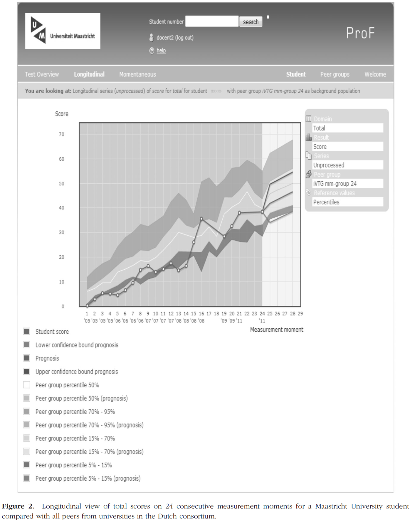 네덜란드 컨소시엄의 학생 결과에 대한 자세한 피드백은 ProF 시스템의 그래픽 질의 기반 온라인 정보를 통해 제공된다(Muijtjens et al. 2010). 그림 2는 네덜란드 컨소시엄(화이트라인)의 같은 해 모든 동료와 비교한 마스트리히트 대학 프로그램 6학년 학생의 24회 연속 측정 순간(연간 4회)에 걸쳐 보정 점수(다크라인)를 사용한 총 점수의 ProF 피드백의 예를 보여준다.