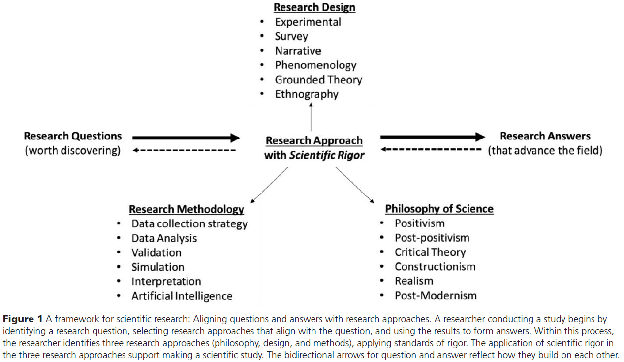 A framework for scientific research: Aligning questions and answers with research approaches. A researcher conducting a study begins by identifying a research question, selecting research approaches that align with the question, and using the results to form answers. Within this process, the researcher identifies three research approaches (philosophy, design, and methods), applying standards of rigor. The application of scientific rigor in the three research approaches support making a scientific study.