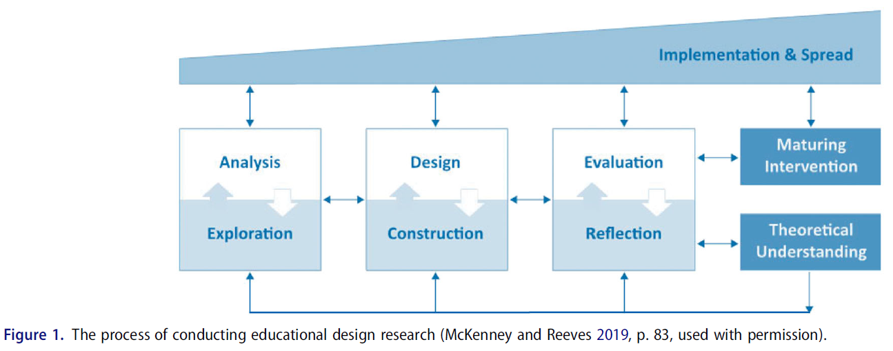 의학 교육 연구자들(Dolmans and Tigelaar 2012; Wolcott et al. 2019)에게 최근에 소개되었지만, EDR은 1990년대 초 다른 교육 환경에서 출현했으며, [교육 연구가 실제에 미치는 영향을 강화]하는 동시에, [이론을 확장 및 정제하는extending and refining 방식]의 하나로서 꾸준히 증가하고 있다. 설계 기반 연구 및 설계 기반 구현 연구와 같은 유사한 접근 방식을 포괄하는 EDR은 2003년부터 현재까지 주요 교육 연구 저널의 여러 특수 이슈에 실렸다. 그림 1은 맥케니와 리브스(2019)가 설명한 EDR의 과정을 보여주고 있다.