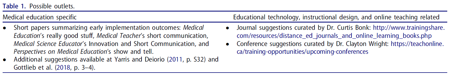 여러분 중 일부는 자신의 연구 프로파일을 만들고 싶어할 수도 있으므로 EDR을 수행하는 것은 혁신이 목표를 달성한 후까지 자신의 연구 결과를 발표하기를 기다려야 한다는 것을 의미할 수도 있다고 우려합니다. 그러나 EDR 프로젝트의 초기 단계부터 연구 결과를 공유할 수 있는 기회를 모색하는 것이 좋습니다. 예를 들어 '분석 및 탐색' 단계 중에 EDR 이니셔티브에 대한 이론적 프레임워크를 설명하는 논문을 작성하거나 EDR이 다루고 있는 문제에 대한 문헌 리뷰를 게시하려고 할 수 있습니다. '평가 및 반영' 단계는 여러 개의 출판 가능한 논문(예: 데이터 수집, 분석 및 개입의 개선의 각 반복마다 하나)을 산출할 수 있다.