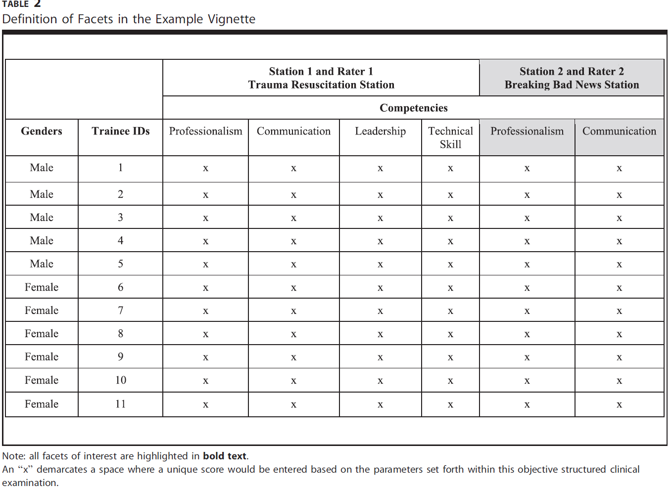In our vignette, we could use G-theory to consider the variance among scores of professionalism, communication, leadership, and technical skills. However, the real power of G-theory is that we can also consider additional sources of variance, such as the gender of the trainee. We could, if we were interested, add in sources of variance like the time of day, different standardized patients, or number of OSCE stations. Table 2 shows how we can keep track of various facets in our vignette to evaluate them for different purposes.