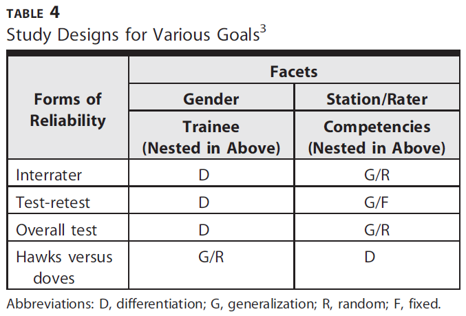 A highly useful theory that informs reliability, validity, elements of study design, and data analysis is Generalizability theory (G-theory).3–6 G-theory is a statistical framework for examining, determining, and designing the reliability of various observations or ratings.3–6
