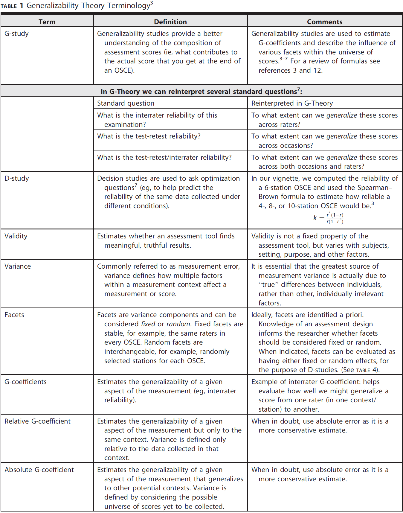 G 이론을 사용하여 우리는 평가 점수의 구성을 더 잘 이해하기 위해 일반화 가능성 연구(G-studies)를 설계할 수 있다(즉, OSCE 종료 시 얻는 실제 점수에 기여하는 것). 그런 다음 서로 다른 조건에서 수집된 동일한 데이터의 신뢰성을 예측하는 데 도움이 되는 의사 결정 연구(D-Studies)를 설계할 수 있다.