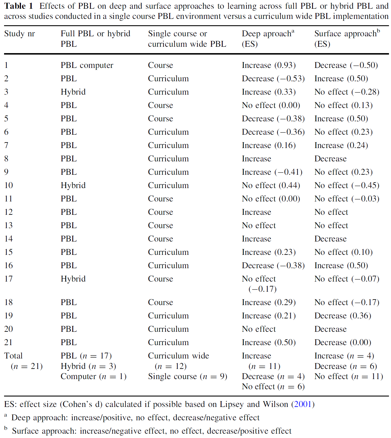 표 1은 21개 연구에 대한 개요를 제공합니다. 이 표 1의 마지막 행에서 볼 수 있듯이, 17개의 연구가 전체 PBL 환경에서 수행되었고, 3개는 하이브리드 PBL 환경, 1개는 PBL 컴퓨터 환경에서 수행되었다. 또한 커리큘럼 전체 PBL 구현에서 12개의 연구가 수행되었고 단일 과정 PBL 환경에서 9개의 연구가 수행되었다. 표 1은 또한 PBL이 11개 연구에서 학습에 대한 심층 접근법을 강화한다는 것을 보여준다. PBL은 네 가지 연구에서 심층 접근법의 감소를 초래하며 다른 여섯 가지 연구에서 심층 접근법에는 영향을 미치지 않는다. 또한, 표 1에 PBL이 11개 연구에서 학습에 대한 표면 접근에 영향을 미치지 않는 것으로 나타났다. PBL은 6개의 연구에서 표면 학습의 감소와 4개의 연구의 증가로 이어진다.