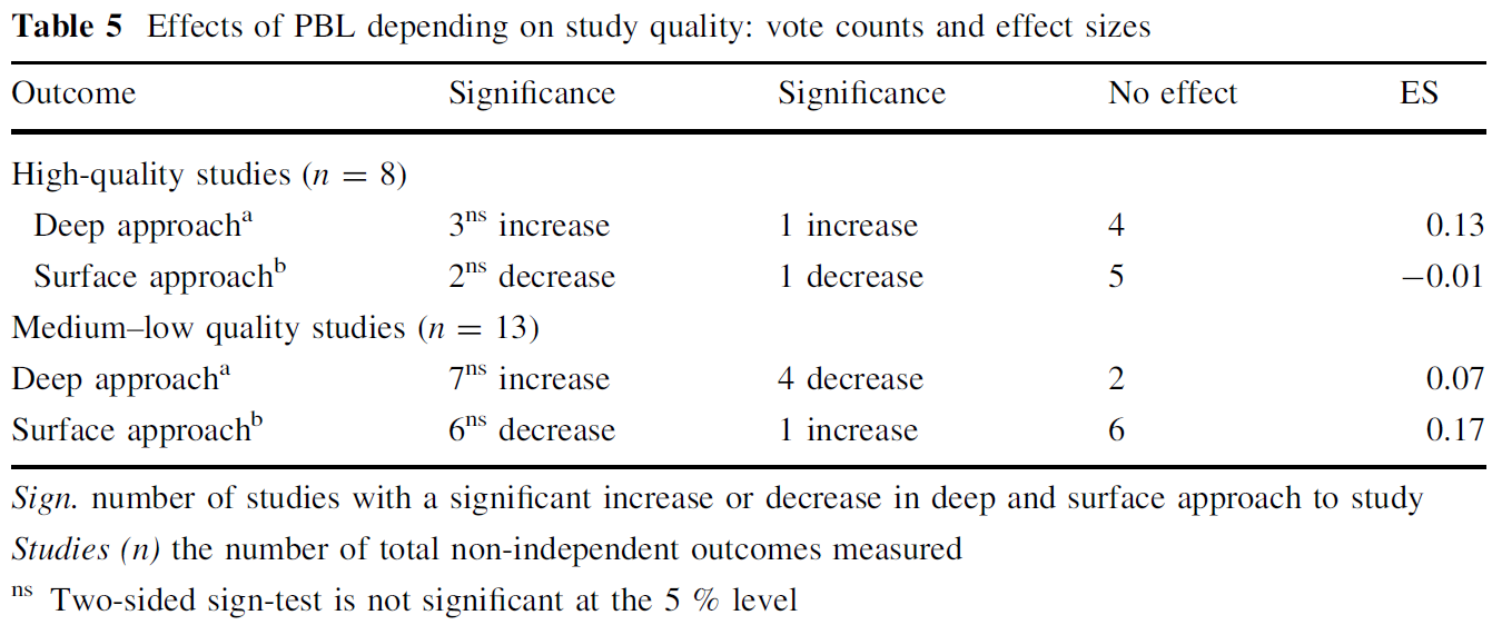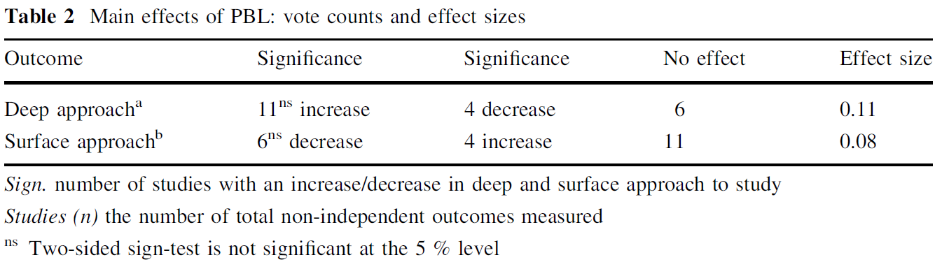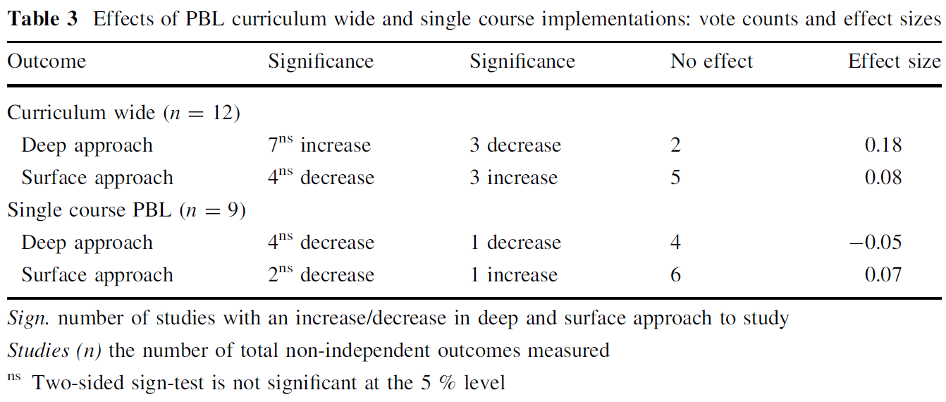- Furthermore, this review demonstrated that differences in effects between the studies could be partly explained by differential characteristics of the environment in which the PBL studies were conducted (a curriculum wide implementation has a more positive impact on students’ deep approach (ES = .18) compared to a single course (ES = −.05) implementation), but not by study quality.