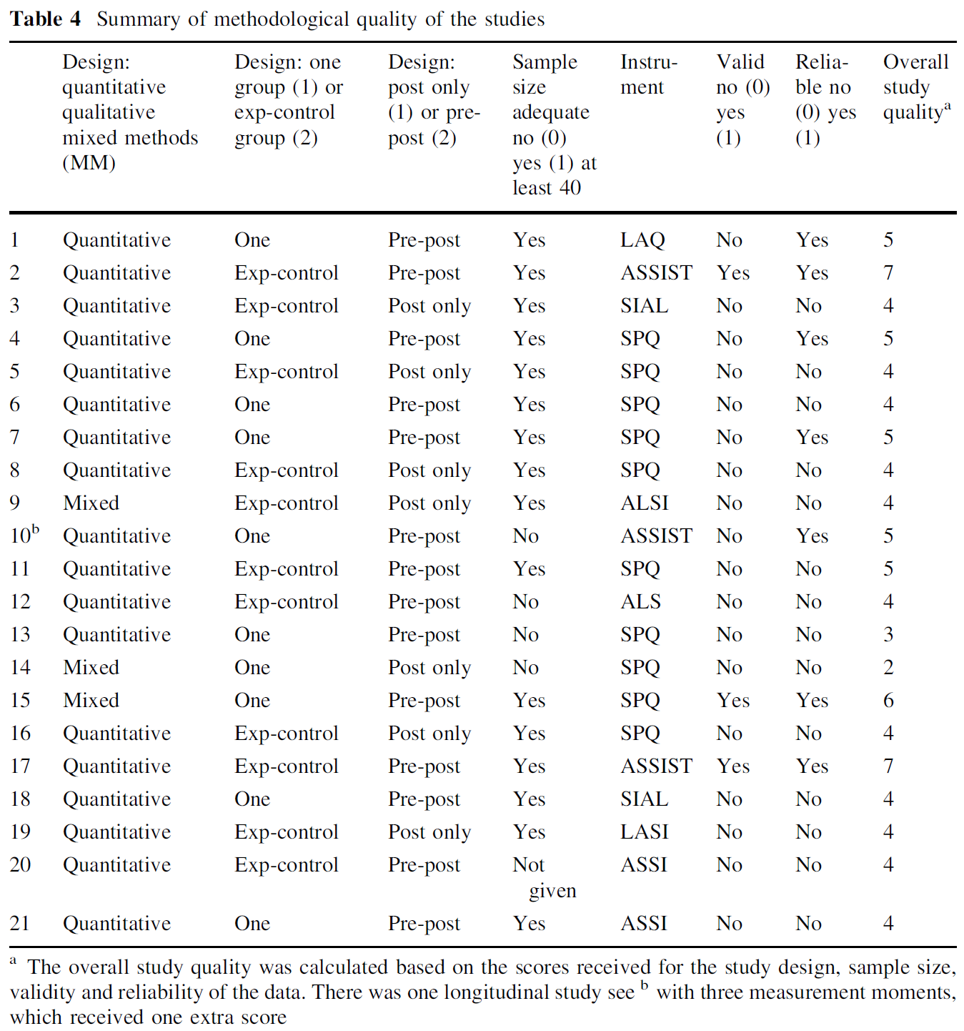 표 4에는 연구의 방법론적 품질이 요약되어 있다. 이 표에서 볼 수 있듯이, 대부분의 연구는 정량적 연구(n = 18)였고, 소수의 연구는 혼합적 연구(n = 3)였다. 연구 설계의 측면에서, 11개의 연구는 실험 통제 그룹 연구를 포함했고 10개의 연구는 하나의 그룹 설계를 사용했다. 총 14개의 사전-사후 테스트 연구 설계가 사용되었으며 7개의 사후 테스트 전용 설계가 사용되었습니다. 단 하나의 연구만이 측정 모멘트가 3개인 종방향 연구였다. 표본 크기는 21개 연구 중 16개 연구 중 40개를 분명히 웃돌았다. 연구의 대부분은 John Biggs와 동료들에 의해 개발된 Study Process Questinate(11개 연구)를 이용했다. 사용된 계측기의 유효성에 대한 연구는 3건, 데이터의 신뢰성에 대한 연구는 7건에 불과했습니다. 총 8개의 연구가 전체 연구 품질 점수(5, 6 또는 7점)가 높았다.