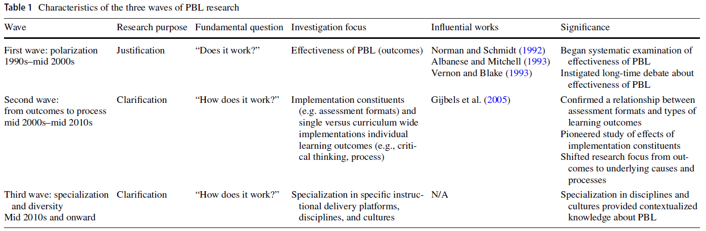 1969년 첫 구현(Servant-Miklos et al. 2019) 이후, 우리는 각각 PBL 커뮤니티의 필요와 이전 연구(그림 1)에 기초한 고유한 초점을 가진 PBL 연구의 세 가지 물결을 확인했다.