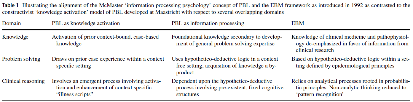The representation of cognitive processes as purely computational has otherwise been recognized as a form of reductionism and has been dubbed with the term “cognitivism” (Haugeland 1978; Varela et al. 1991). The central thesis of this commentary may now be stated. It is that the EBM educational paradigm, as proposed in 1992, including its proposed de-emphasis on pathophysiological knowledge and clinical experience, was closely aligned with the IPP, or “cognitivist”, understanding of the PBL construct that emerged and dominated the McMaster curricular approach during the late 1970s and 1980s. Before elaborating this thesis, we must briefly acknowledge the existence of an alternative to the IPP model of PBL.
