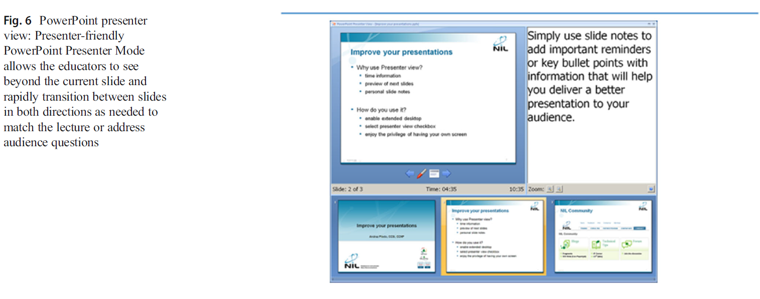 Plot the structure in advance before incorporating specific text and images and before ordering individual slides. A presentation can be outlined using a storyboard format. This approach avoids a key pitfall of organizing primarily with an attractive list of potential bullet points. Left unembellished, and in the presence of too little practice time, bullet points read aloud become the Achilles’ heel for the speaker. PowerPoint editing capabilities and practicing allow the presentation to be progressively truncated until only keywords and supportive images survive the finished product. In contrast, the text-heavy versions can be saved as PowerPoint “notes to the speaker” or in an audience handout. At first, this approach seems time intensive but it actively utilizes practice time to serially truncate the text, creating space for the speaker. Although “space” might promote speaker anxiety, the “presenter view” function in PowerPoint versions after 2013 allows only the speaker to see these notes. This feature stimulates the speaker’s memory, provides an organized series of “silent” speaker prompts, and maintains a seamless flow of text and images for the audience (Fig. 6).