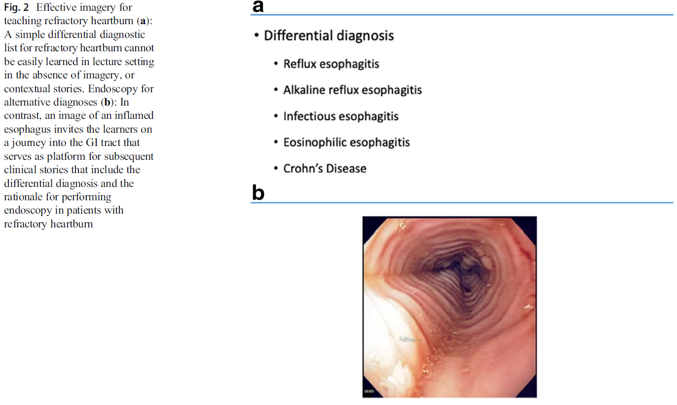 Effective slide design is a predictable and reproducible science. First, minimize the number of words on each slide while maximizing the use of images. Images stimulate the visual channel while the auditory channel incorporates the speaker’s words. “Beyond Bullet Points” (circa 2010) operationalizes this strategy. For example, a slide title that uses a complete phrase sets the stage for complementary visual and auditory processing of the speaker’s point. An image that reflects the slide title provides complementary visual stimulation for the auditory component without reading aloud [27]. An example of a poorly designed slide is shown wherein a two-word title accompanies a long diagnostic list illustrating ineffective slide making (Fig. 2a). The second panel (Fig. 2b) illustrates an effective title that “tells” the audience in words what the speaker will address above an “image of interest” that stimulates the speaker to discuss the associated diagnostic list. Dual-channel theory engages the audience without forcing the speaker to read aloud and avoids the first cardinal teaching sin. Text-heavy slides are occasionally appropriate but pared down text minimizes distractions, fosters topic understanding, and focuses audience attention on the speaker [2].