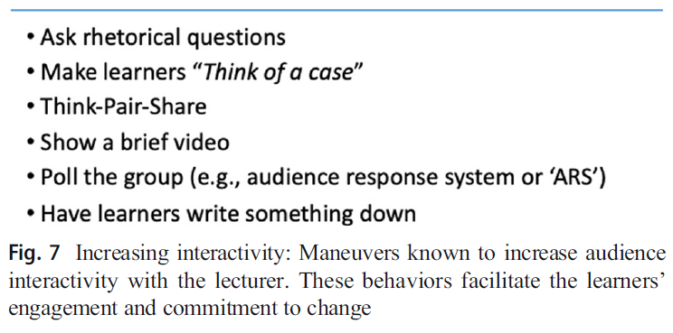 이 관찰은 내용이 "잘 말하는 사람"에 의해 청중에게 더 효과적으로 전달된다는 것을 시사하며, 다른 사람들에 의해 나중에 복제되는 발견인 상당한 교육적 편익[28]으로 해석한다[18]. 청중들을 끌어들이기 위한 열쇠는 그들의 관심을 끌고 붙잡아야 한다. 교육자의 경우 불행히도 [성인 집중력 기간은 10분]으로 제한되어 있으므로, 고전적인 50분 강의를 위한 참여 유지라는 화자의 과제가 복잡해진다. 더구나 이러한 '10분'의 주의력을 입증한 연구는 스마트폰과 소셜미디어 시대 이전에 이루어졌으며, 오늘날 청취자의 주의력 범위는 더욱 짧아진 것으로 생각된다. 다행히, 청중 집중력 기간은 다양한 형식과 아래에서 논의한 대화형 특징을 추가하고 강의 내내 주요 교육 포인트를 반복함으로써 주기적으로 "재설정"될 수 있다.