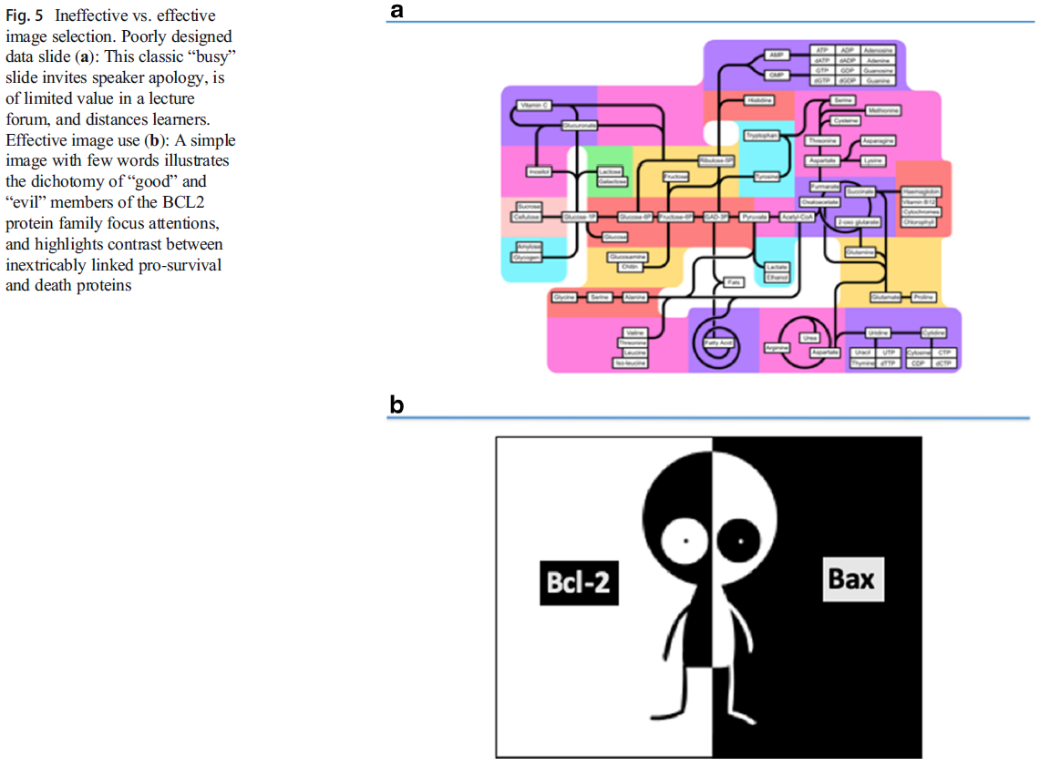 효과적인 슬라이드 설계는 예측 가능하고 재현 가능한 과학이다. 첫째, 이미지 사용을 극대화하면서 각 슬라이드의 단어 수를 최소화합니다. 청각 채널이 화자의 말을 통합하는 동안 이미지는 시각 채널을 자극한다. "Beyond Bullet Points"(circa 2010)는 이 전략을 운용한다. 예를 들어, 완전한 문구를 사용하는 슬라이드 제목은 화자의 포인트에 대한 보완적 시각 및 청각 처리를 위한 단계를 설정한다. 슬라이드 제목을 반영하는 이미지는 소리를 크게 읽지 않고 청각 구성요소에 보완적인 시각적 자극을 제공한다 [27]. 잘못 설계된 슬라이드의 예가 두 단어 제목에서 비효율적인 슬라이드 제조를 설명하는 긴 진단 목록과 함께 표시된다(그림 2a). 두 번째 패널(그림 2b)은 스피커가 관련 진단 목록을 논의하도록 자극하는 "관심 이미지" 위에 말하는 사람이 무엇을 말할 것인지를 말로 청중에게 "알려주는" 효과적인 제목을 보여준다. 이중 채널 이론은 화자가 큰 소리로 읽도록 강요하지 않고 청중을 사로잡고 첫 번째 주요 교수 죄악을 피한다. 텍스트 중심의 슬라이드는 간혹 적절하지만, [텍스트를 줄이는 것]이 주의 산만함을 최소화하고 주제 이해를 촉진하며 청중의 주의를 스피커에 집중시킨다 [2].