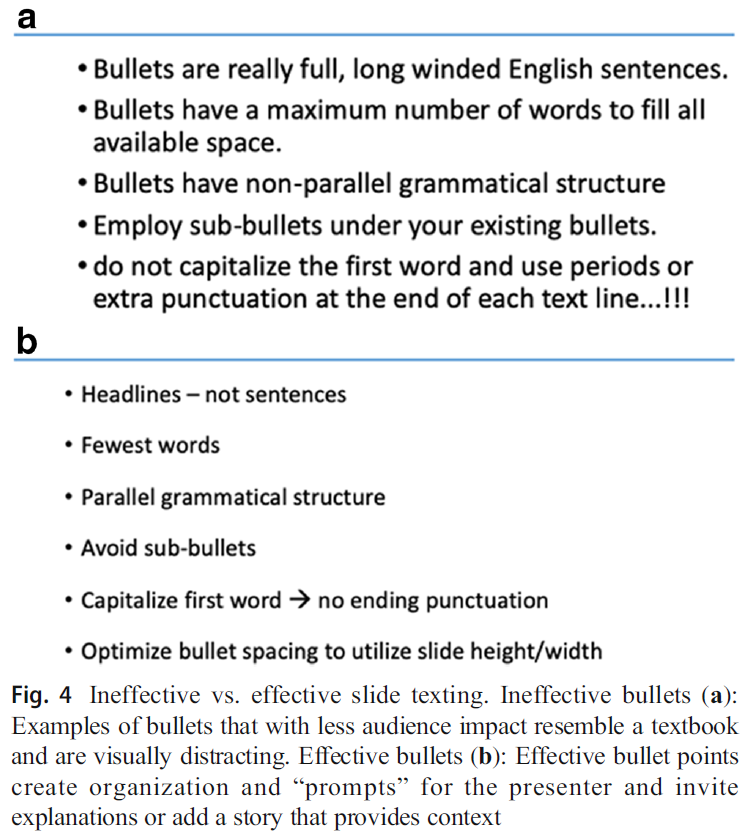 Bullet points are a ubiquitous thread in most PowerPoint presentations and a key organizational tool. The improper (Fig. 4a) and proper (Fig. 4b) use of bullet points is also illustrated. The first shows bullets that are poorly designed, with each one displaying a mistake described in the text. In contrast, the alternative slide is both compact and effective. When text lines are sequentially “built,” the audience focuses on each point in an uncluttered slide as the speaker creates a story that links the text. To summarize, bullets are not full sentences but “headlines” with a parallel grammatical structure. To optimize structure, the first word of the bullet is capitalized and without punctuation. Multiple sub-bullets require smaller fonts, are often hard to read, and can violate the “6 × 6 rule.”