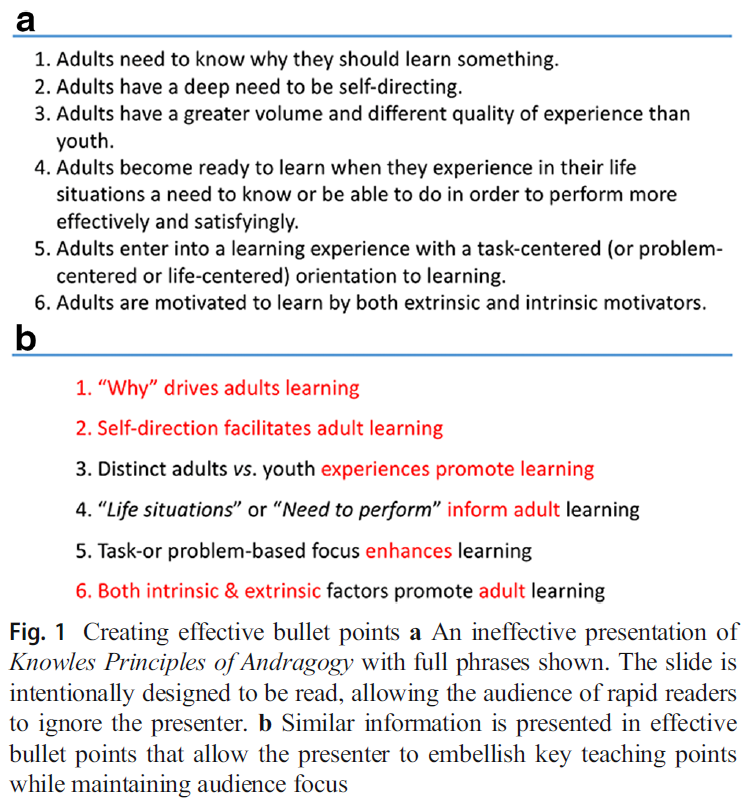Using principles of adult learning to plan a lecture increases its impact. These principles, articulated by Malcolm Knowles, are a valuable conceptual framework for teaching adult learners. Despite some controversy [19], these principles remain useful for designing effective teaching sessions [14]. An ineffective (Fig. 1a) vs. effective (Fig. 1b) slide listing Knowles Principles of Andragogy is shown.