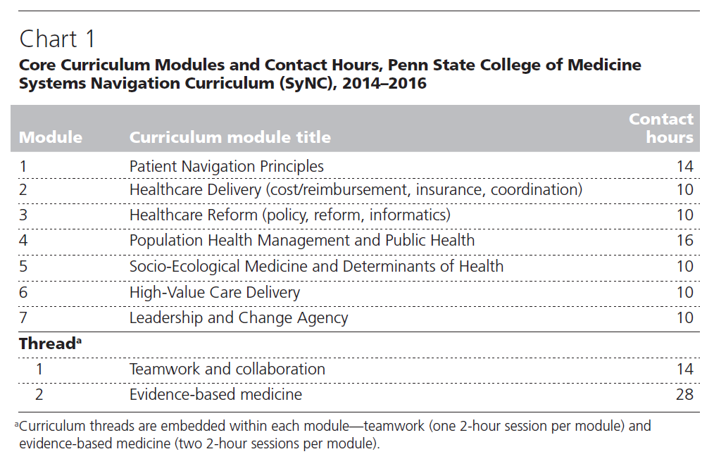 In the fall of 2014, we developed and implemented a new curriculum for all medical students at the Pennsylvania State University College of Medicine (PSUCOM)—namely, the Systems Navigation Curriculum (SyNC). This curriculum consists of conceptual and experiential components: (1) the Science of Health Systems Course, and (2) patient navigator experiences. In total, these two components involve an average of three to four hours per week in our students’ first two years of medical school. Both the course (conceptual component) and navigation experiences (experiential component) allow students to develop the knowledge, attitudes, and skills to function effectively amid the complexities of an evolving health care system. SyNC’s goals are that students: