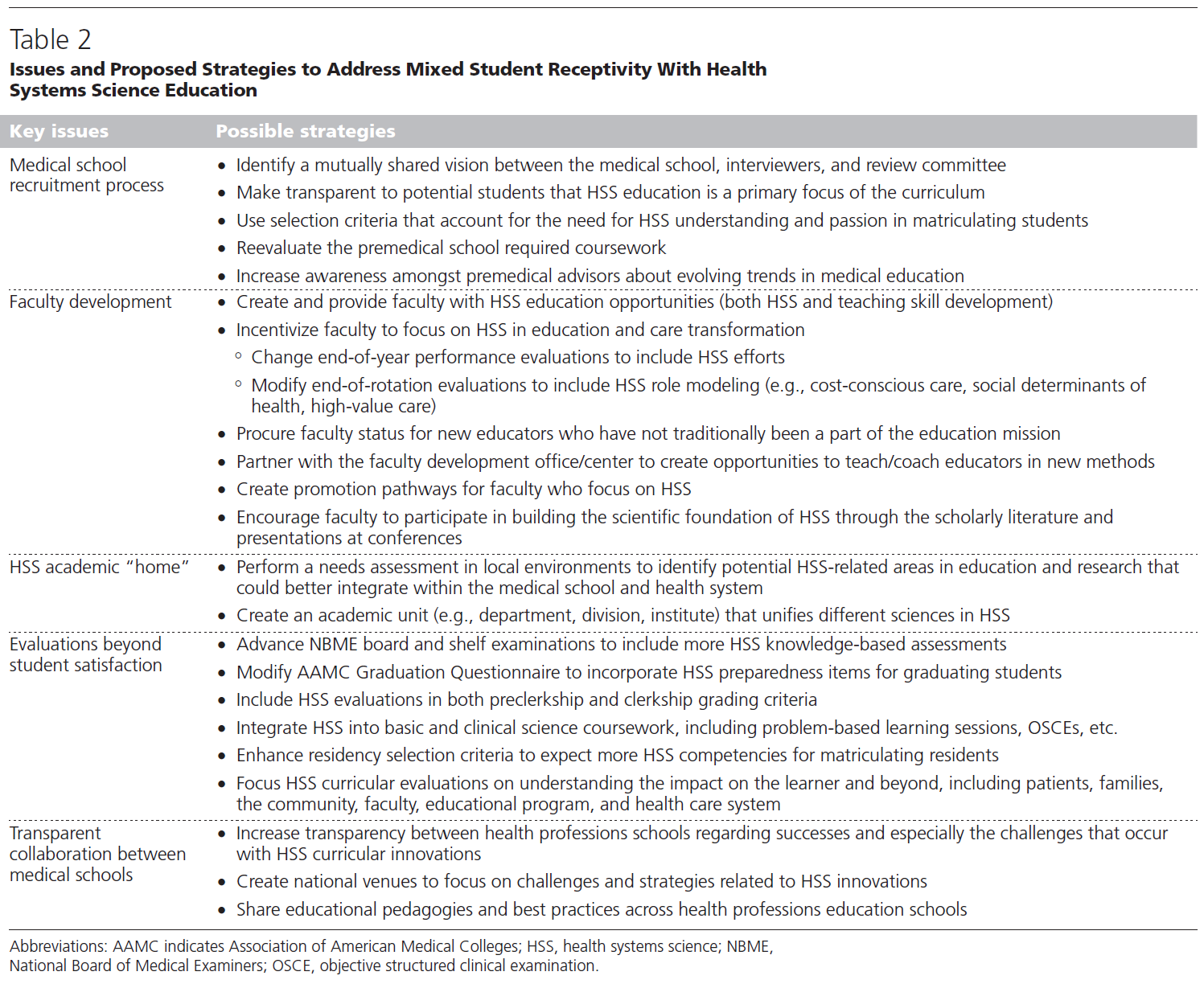 We believe that these drivers influencing student receptivity of HSS coursework and the HSS performance gap (Figure 1B) prompt a reexamination of 5 key issues for medical schools (see Table 2 for descriptions and strategies). We hypothesize that addressing these 5 areas will accelerate recovery of the implementation dip and some closure of the HSS performance gap and will facilitate achievement of “new highs” for HSS curricula.
