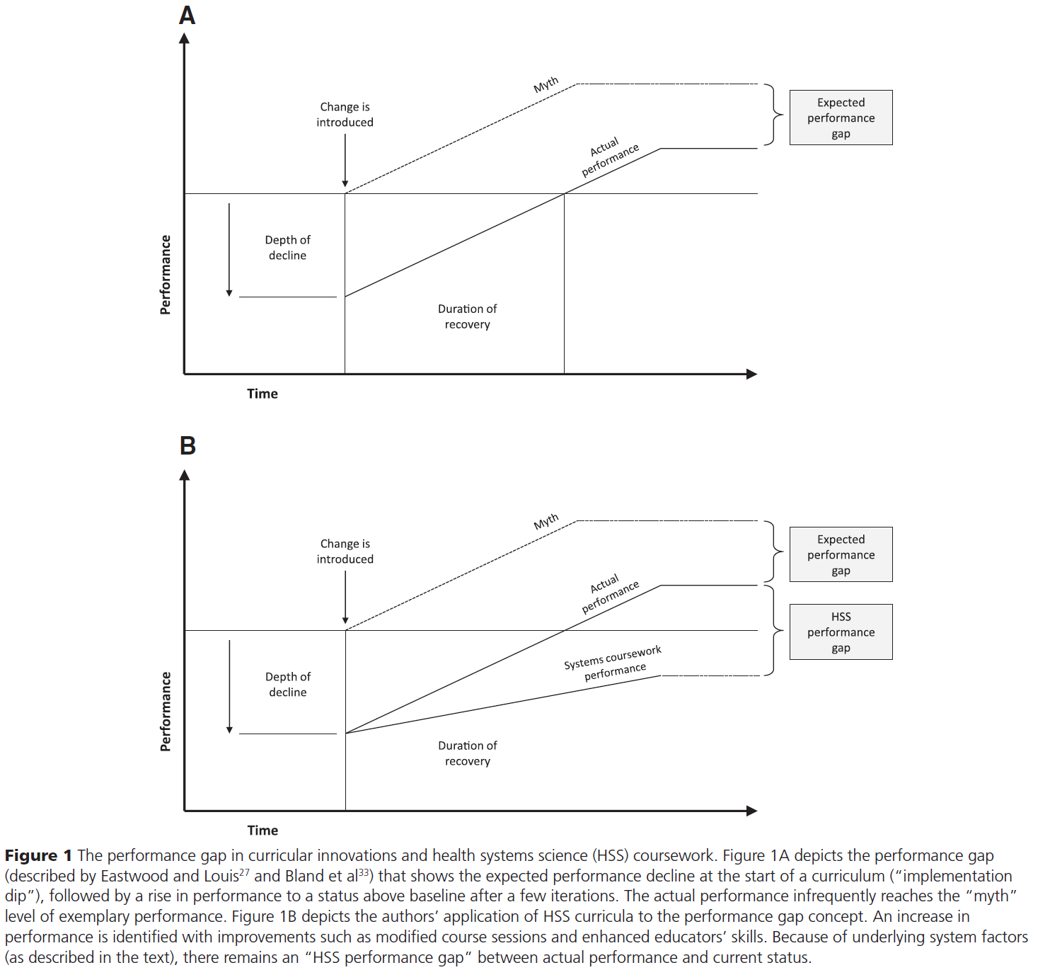 HSS 과정에는 대부분의 다른 커리큘럼과 차별화되는 고유한 요소가 있어 "성과 격차"를 재평가할 수 있다. 대부분의 커리큘럼에서의 implementation dip에 뒤따르는 수 개월에서 수 년의 복구와 달리, HSS 과정 연구는 전체 복구와 지역 및 대규모 의료 교육 변화의 조합을 위해 최소 몇 년의 시간이 필요할 것으로 본다. 우리의 경험을 바탕으로, 우리는 HSS 성능 격차의 6가지 주요 원인을 탐구한다.
