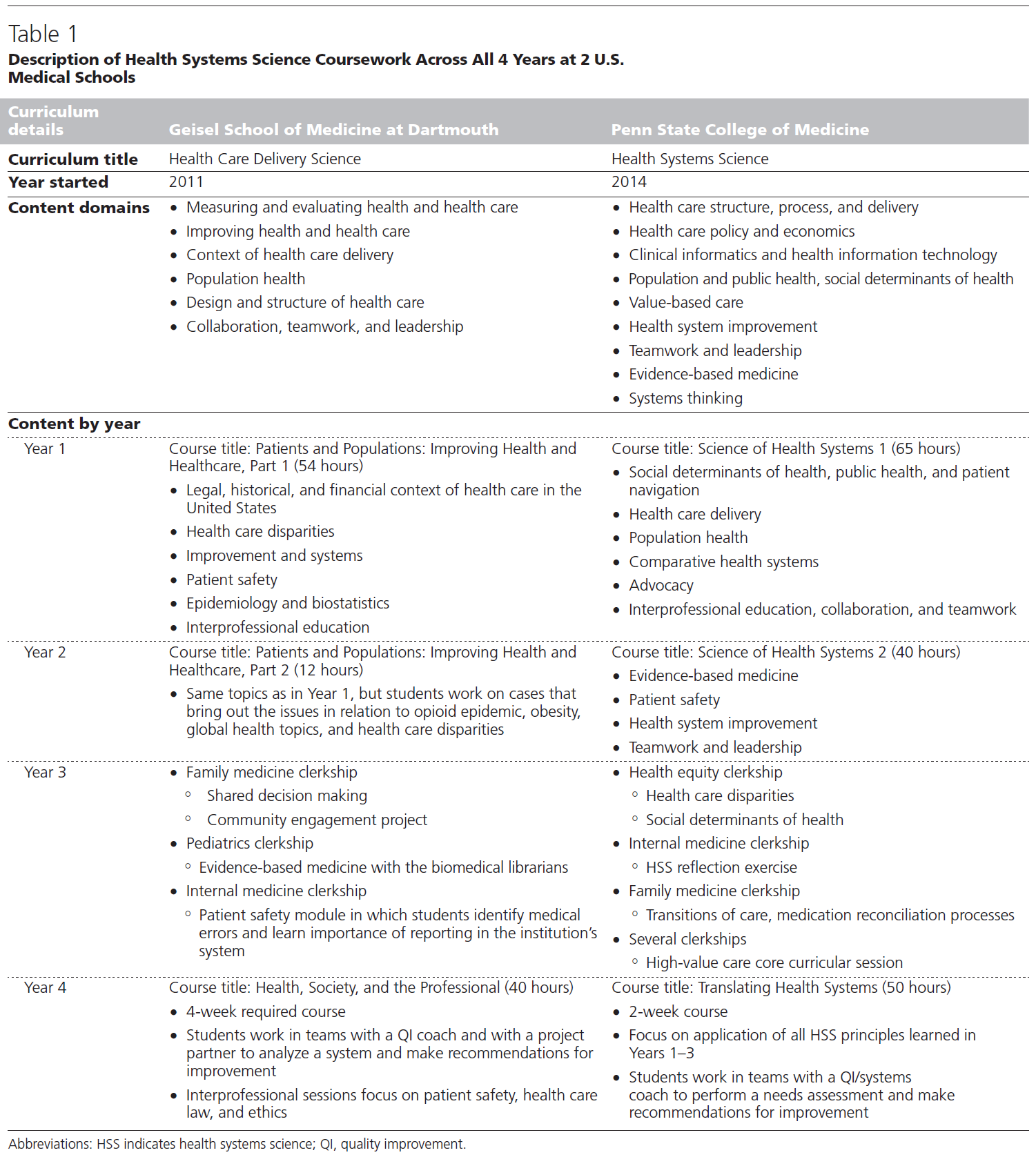 다트머스의 가이젤 의과대학과 펜 주립 의과대학(PSCOM)은 모두 HSS에 통합된 종방향 콘텐츠를 구축한 몇 년간의 경험을 가지고 있다. 가이젤은 의료 전달 과학 제목을 사용하는 반면, PSCOM은 HSS를 사용하지만 도메인, 콘텐츠 및 기술은 유사합니다(표 1). 이 두 가지 종단 커리큘럼은 모두 학생들이 임상 전 해에 기본 개념을 배우고, 서기에 적용하며, 의과대학이 거의 끝나갈 즈음에 캡스톤 경험을 할 수 있도록 만들어졌다.