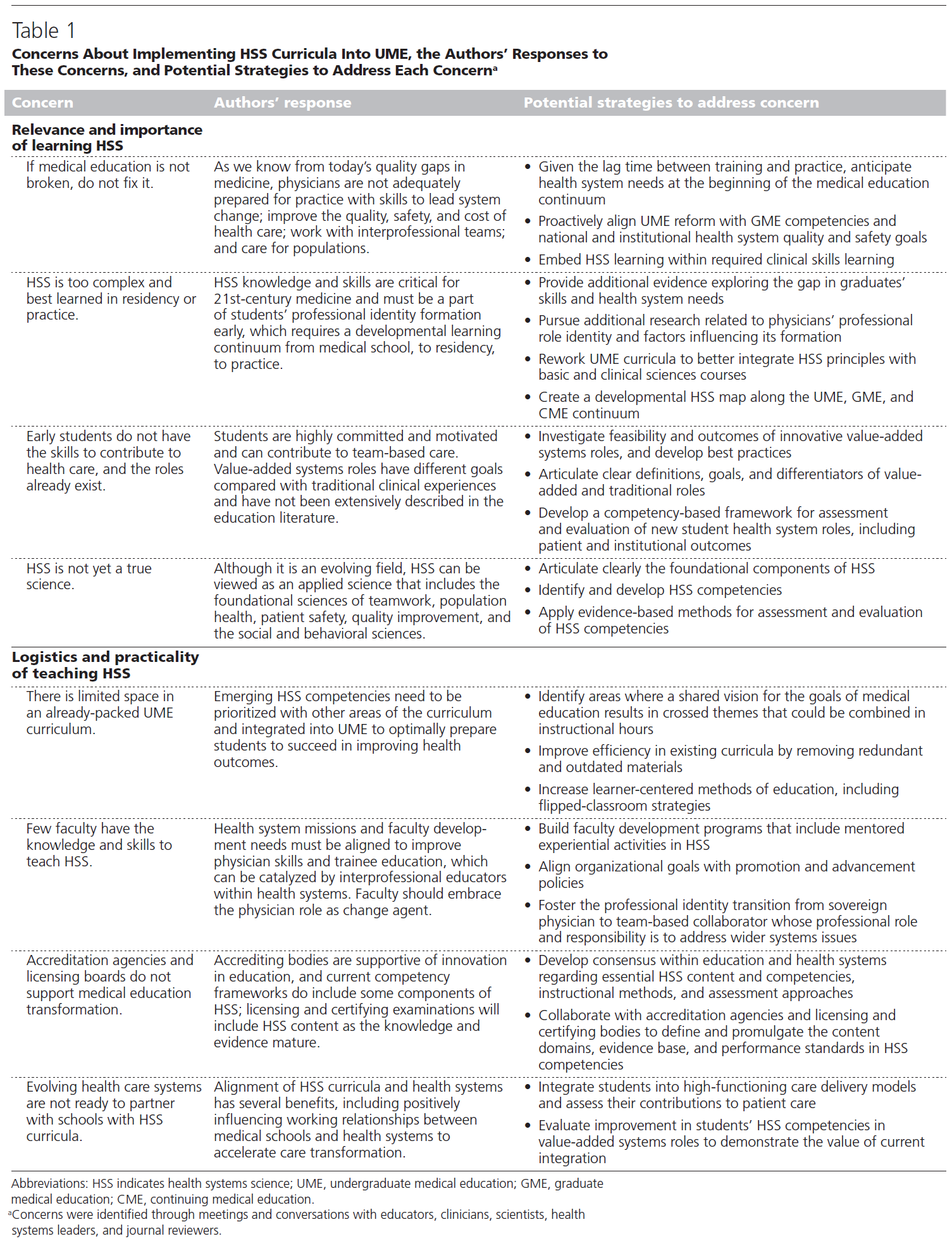 From our meetings and conversations with educators, clinicians, scientists, health systems leaders, and journal reviewers (for simplicity, hereafter participants), we identified two broad categories of concerns regarding integration of HSS into UME: