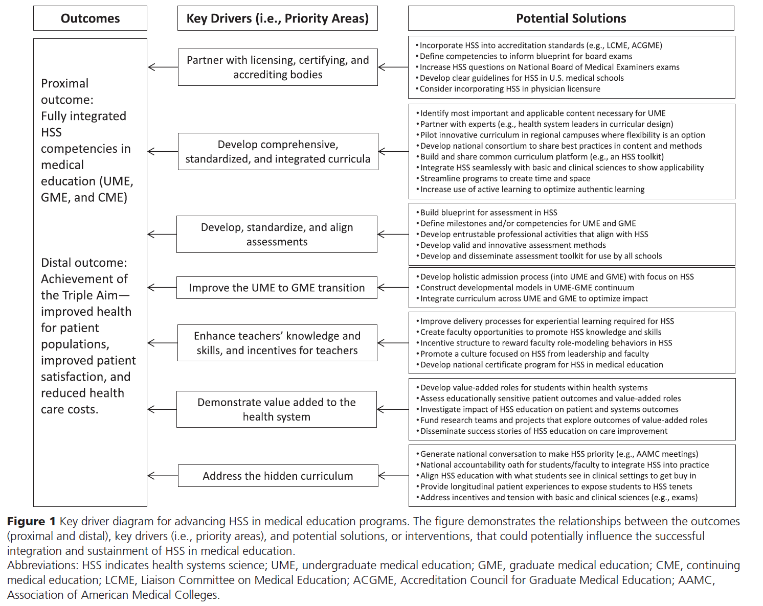 Additionally, there are currently no standards or mechanisms allowing schools to reach agreement on which of the HSS domains (see above) should be included in the curriculum. The medical education community, along with the organizations responsible for segments of medical training and regulation (such as the LCME, ACGME, and United States Medical Licensing Examination), has not yet developed a coordinated approach to this issue. Although medical schools have added HSS content to their curricula, these additions have largely been developed for and tailored to local needs and curricula, with few collaborations across UME programs.20,22 Likewise, the medical education literature on HSS has been fragmented, with no known attempts to provide a comprehensive strategy for developing and executing effective HSS curricula across the whole of medical training.22