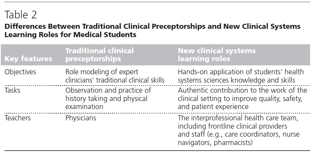 생산성 요구와 품질 기대치가 높아짐에 따라, 의료 교육 및 보건 시스템은 상호성과 유사한 목표를 지향할 필요가 있다. 의학교육의 관점에서, 학생들을 위한 적절한 수의 임상 학습 사이트를 유지하기 위해서는 변화가 필요하다. 일부 교실classroom에는 보건 시스템 주제가 존재하지만, 학생의 건강 관리 경험을 살려줄 수 있는 [경험적 학습 기회]가 거의 없다. 학생들이 신체 검사와 환자 의사소통의 기술을 다듬는 데 도움이 되는 [핸즈온 임상 기술 학습 경험]과 마찬가지로, 이제 모든 학생들을 위한 새로운 [시스템 활동]이 필요하다.