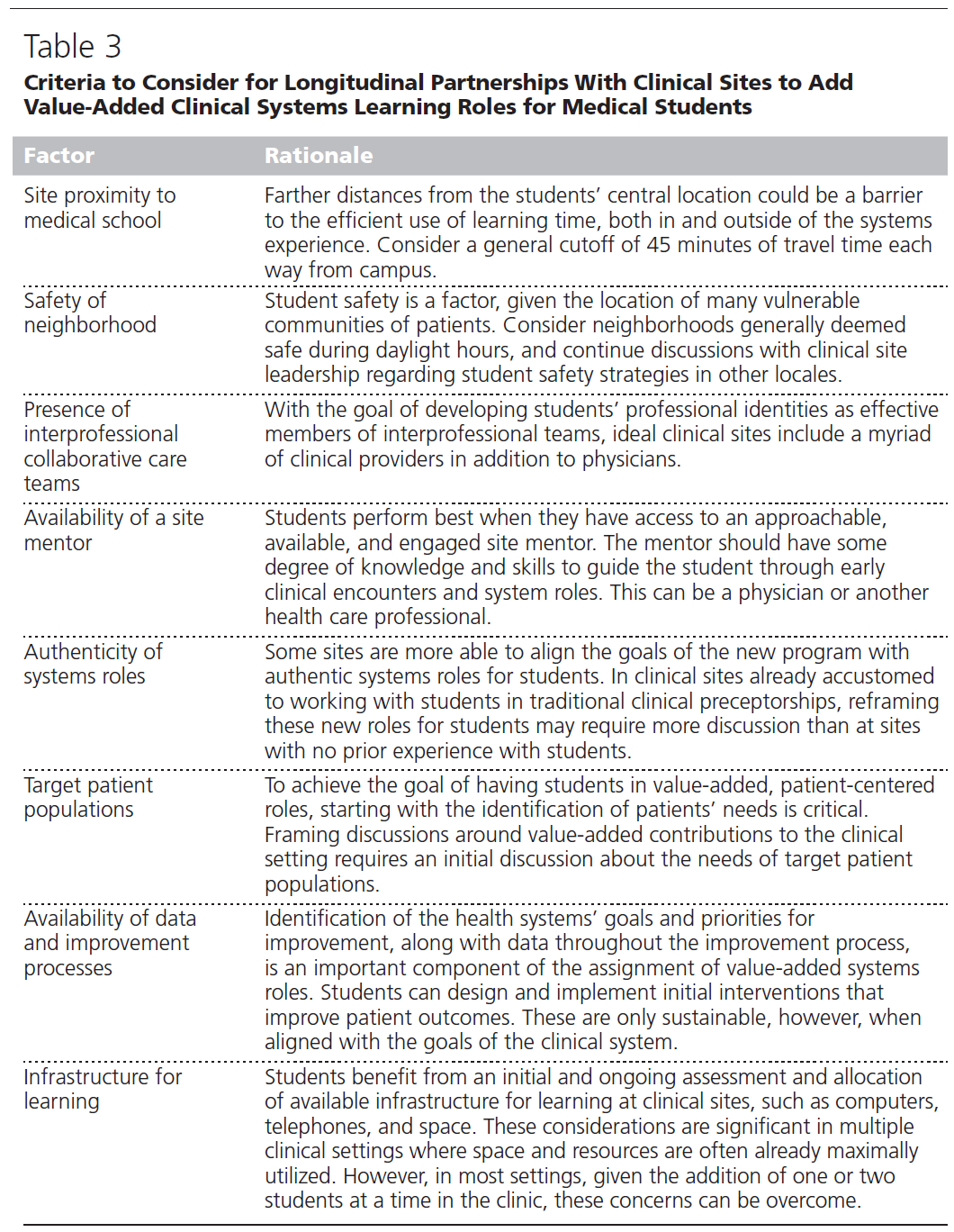 Curricular time for longitudinal, meaningful clinical systems learning roles and tasks would allow medical students to gain a broader perspective of patients’ experiences of health, illness, and the interprofessional care delivery system.13,24,25