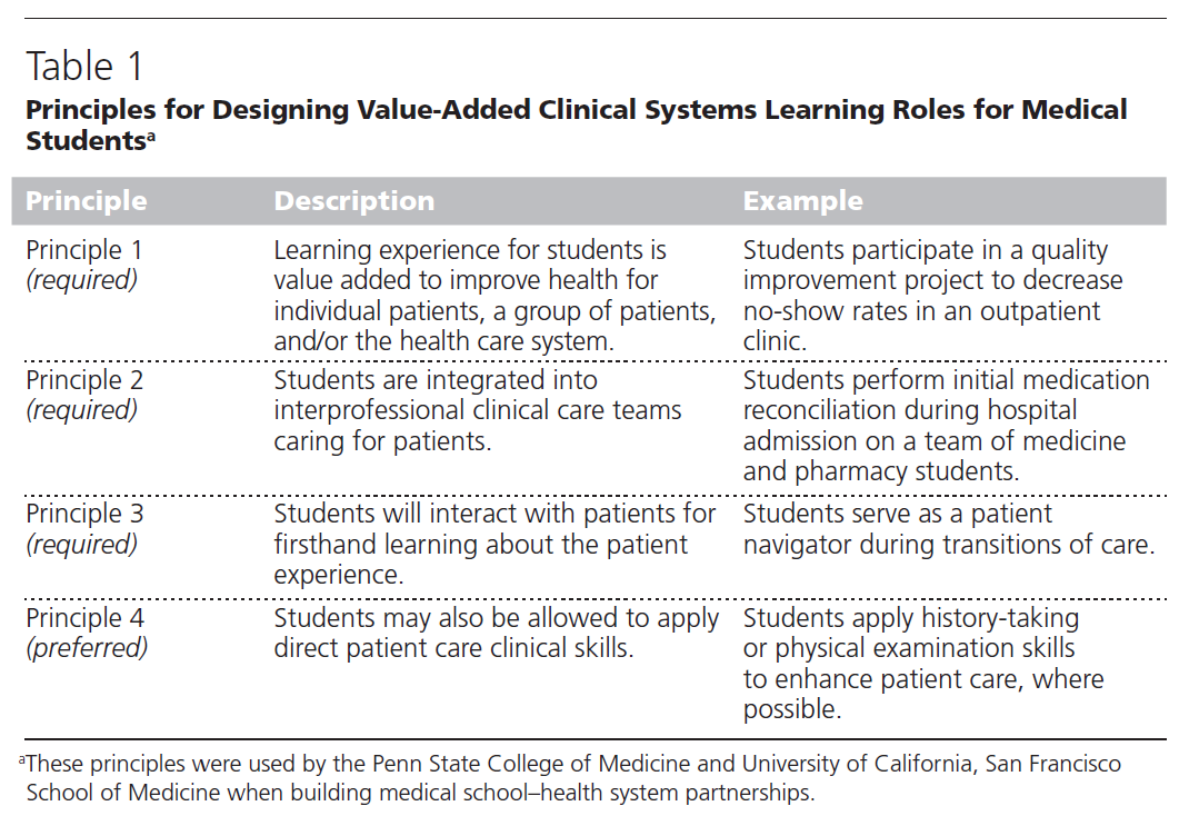 For academic institutions, the quality of the medical school has implications for the success of the health system, and vice versa. Value-added clinical systems roles for students allow medical education to help advance the health system, creating synergy for long-term success.