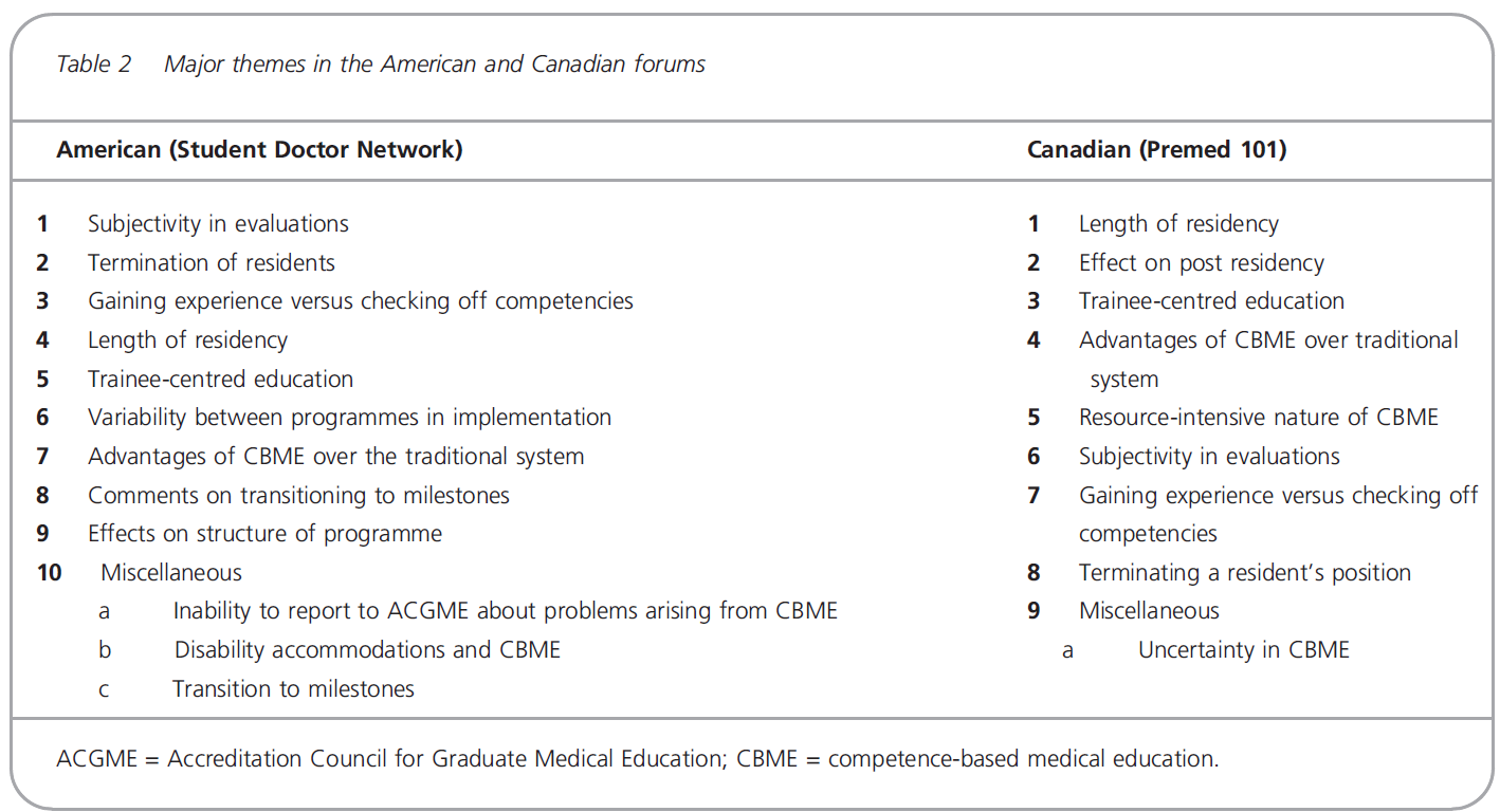 - Background: Competency-based medical education (CBME) is becoming widely implemented in medical education. Trainees' perceptions of CBME are important factors in the implementation and acceptance of CBME. Online discussion groups allow unique insight into trainees' perceptions of CBME during residency training.Results: Medical residents and students participating in the discussion forums emphasised select themes regarding the implementation of CBME in residency training. Concerns about CBME in Canada primarily involved its implications for the length of residency and post-residency opportunities. Posts on the American forum had a prominent focus on differing areas, such as the subjectivity in the assessment of core competencies and the role of CBME in termination of a resident's position.