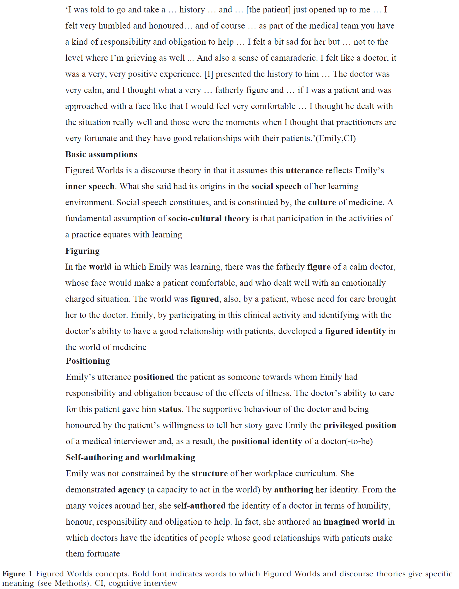 그림 1은 에밀리가 서술하는 텍스트의 축약된 버전을 제시하며, 연구의 주요 결과를 예시하고 Figured Worlds 개념을 설명하기 때문에 이 텍스트가 일부러 선택되었습니다. 이것과 다음 두 단락은 에밀리의 감정의 기원을 에밀리의 정체성 발달과 연결짓는다. 동시에, 에밀리는 [공감적으로 슬퍼하는 부정적인 감정]과 [동지애의 긍정적인 감정], [환자의 자신감으로 받아들여지는 영광스러운 감정]을 경험했다.