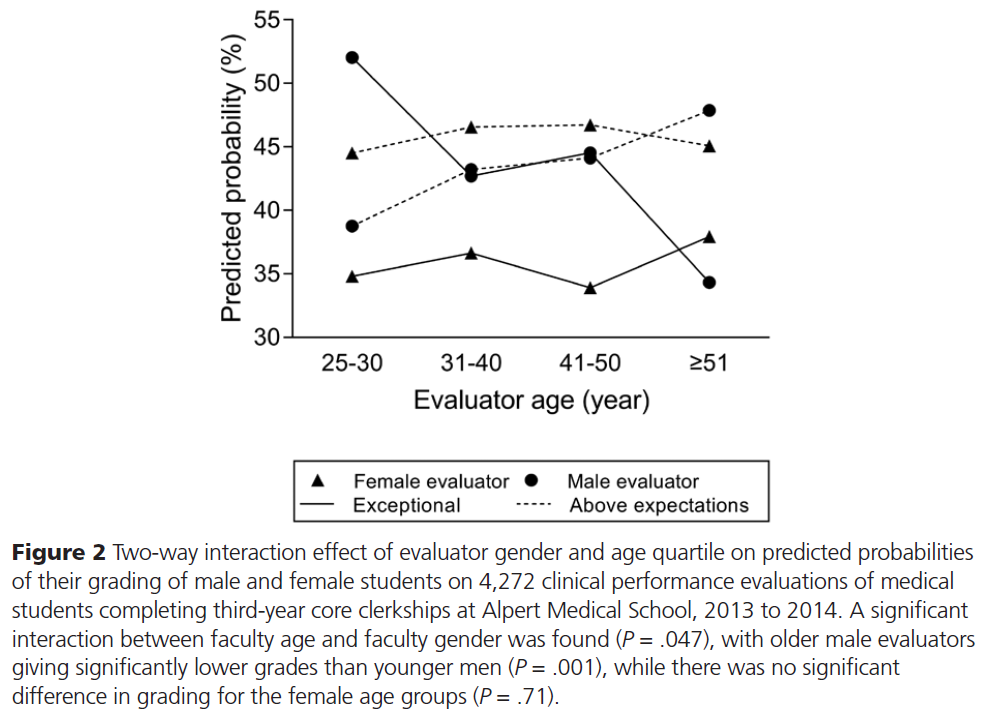Our data also found a significant interaction between evaluator age and gender, with younger male evaluators awarding higher grades than older male evaluators and than female evaluators in all age groups. While younger evaluators have been found to be more lenient graders in other studies,27,28 to our knowledge the age–gender interaction has not been examined elsewhere, and this finding warrants additional investigation. Again, it is concerning that intrinsic evaluator characteristics have led to differential grading of students. Either improved training of graders is needed, or the characteristics of the evaluators must be taken into account when considering their ability to give fair clerkship grades.
