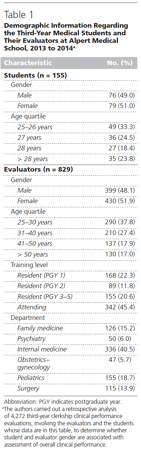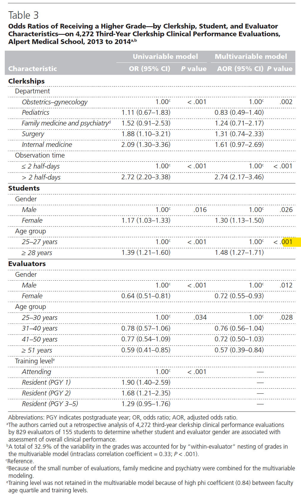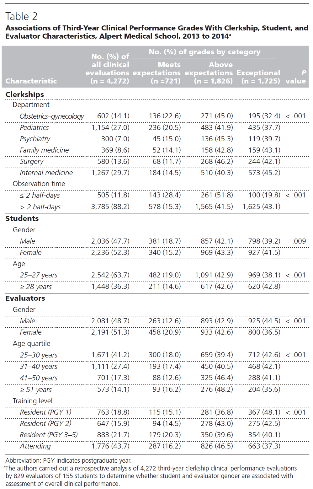 - Method: This was a retrospective analysis of 4,272 core clerkship clinical performance evaluations by 829 evaluators of 155 third-year students, within the Alpert Medical School grading database for the 2013-2014 academic year. Overall clinical performance, assessed on a three-point scale (meets expectations, above expectations, exceptional), was extracted from each evaluation, as well as evaluator gender, age, training level, department, student gender and age, and length of observation time. Hierarchical ordinal regression modeling was conducted to account for clustering of evaluations.
