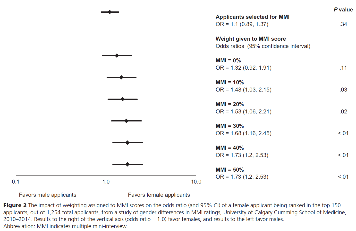 - Method: Cumulative meta-analysis was used to compare MMI ratings for female and male applicants to the University of Calgary Cumming School of Medicine between 2010 and 2014. Multiple linear regression was then performed to explore gender differences in MMI ratings after adjusting for other variables, followed by a sensitivity analysis of the impact of varying the weight given to MMI ratings on the odds of females being ranked in the top 150 applicants for 2014.