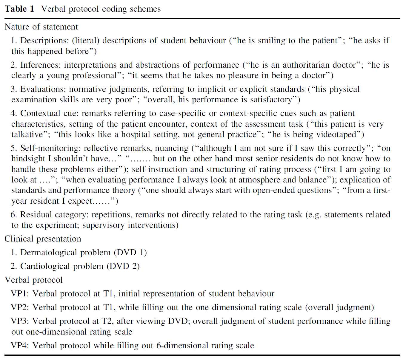 Each segment was assigned to coding categories, using software for qualitative data analysis (Atlas.ti 5.2). Different coding schemes were used to specify ‘the nature of the statement’; ‘type of verbal protocol’ and ‘clinical presentation’ (Table 1). The coding categories for ‘nature of statement’ were based on earlier studies in expert-novice information processing (Kerrins and Cushing 2000; Boshuizen 1989; Sabers et al. 1991) and included