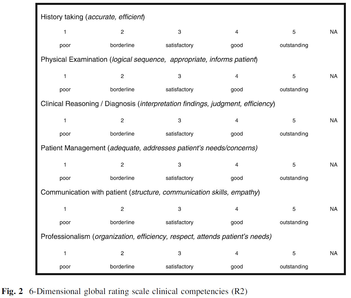 - a list of six clinical competencies (history taking; physical examination; clinical reasoning and diagnosis; patient management; communication with the patient; and professionalism), each to be rated on a five-point Likert scale (1 = poor to 5 = outstanding) (R2).