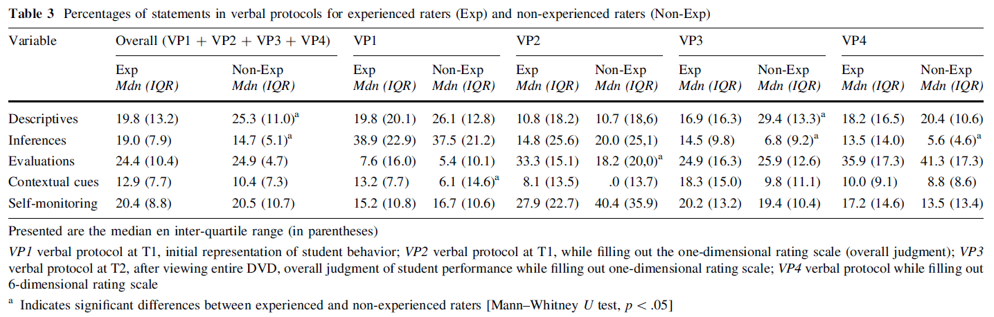구두 프로토콜의 경우, 전체적인 결과는 성과를 관찰하고 판단하면서 정보 처리에서 전문가와 비전문가 사이의 차이로 생각했던 가설을 확인하여주었다. 경험이 없는 평가자와 비교했을 때, 경험 있는 평가자는 [학생 행동의 정보에 대한 추론과 해석]을 더 많이 생성한 반면, 경험이 없는 평가자는 [관찰된 행동에 대한 더 문자 그대로의 설명]을 제공했다. 이러한 발견은