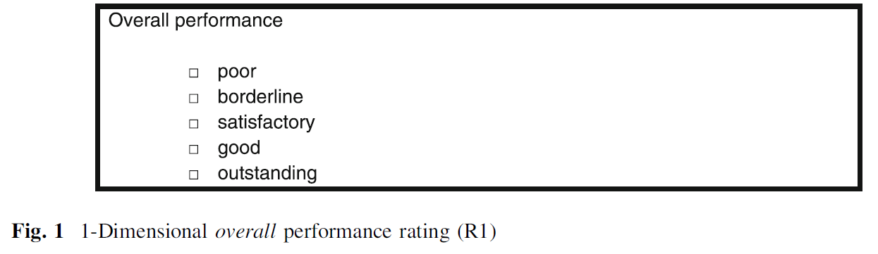 - a one-dimensional, overall rating of student performance on a five-point Likert scale (1 = poor to 5 = outstanding) (R1), and