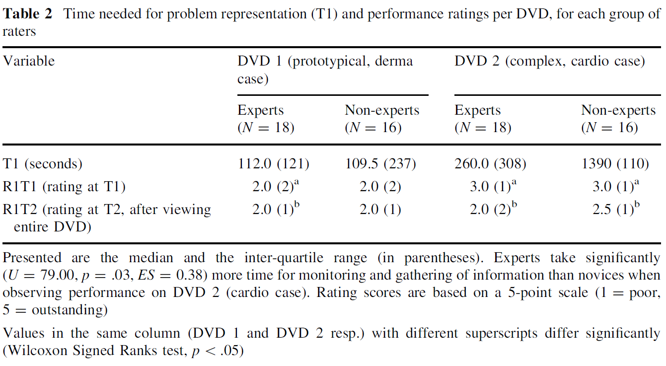 그러나 심장내과 사례에 대한 우리의 결과는, [더 복잡한 행동]에 대해서, [경험 있는 평가자]들이 초기 정보에 대한 해석과 관련하여 [경험이 없는 평가자]들과 다른 것으로 보인다는 것을 확인시켜 준다. 경험 있는 평가자들은 추가 정보를 검색하고 훈련생 행동에 대해서 더 긴 시간 모니터링을 한다.