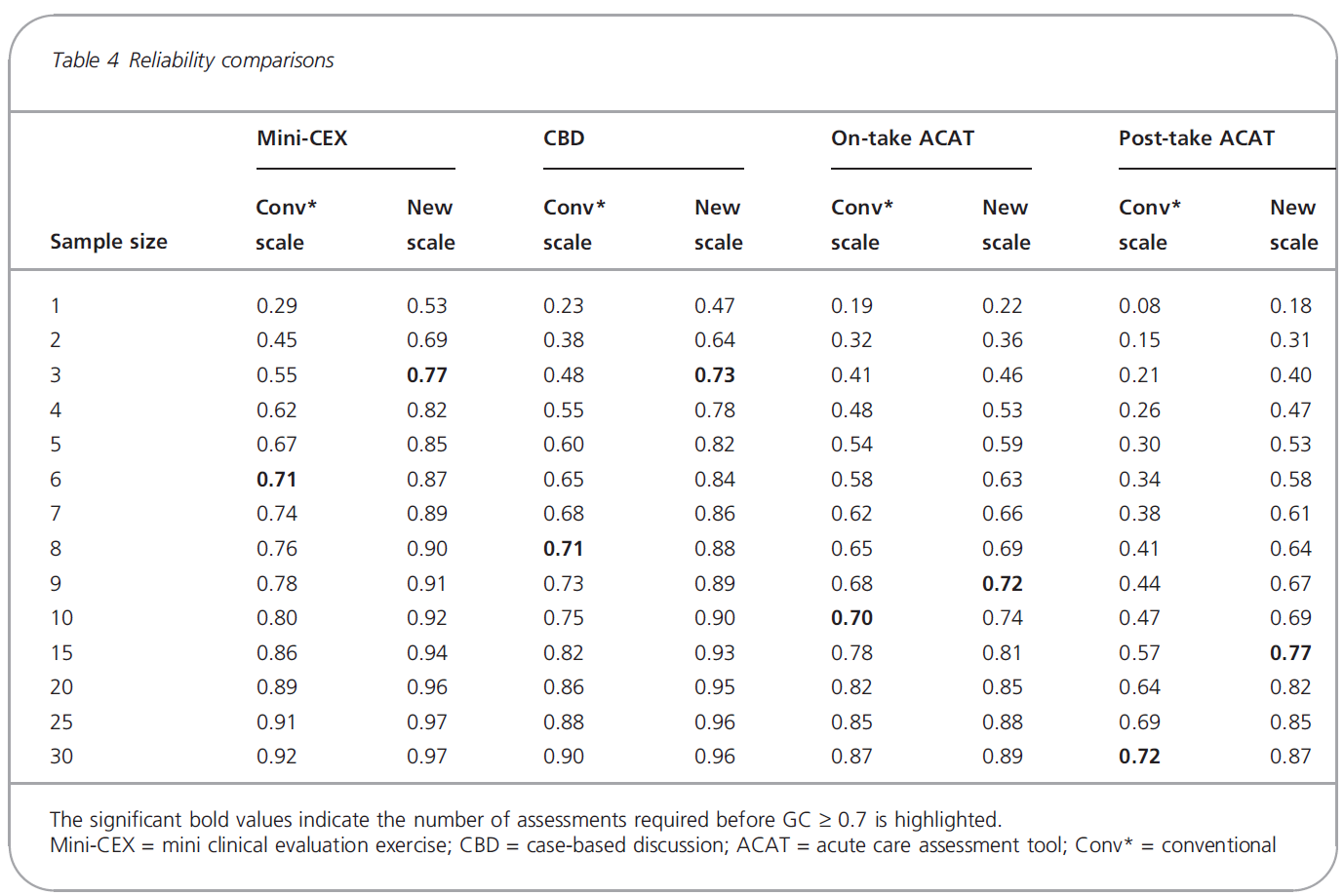 Reliability is a product of both good discrimination and good reproducibility. In three of four contexts, the difference in reliability was large and reduced thenumber of assessors and episodes required to achieve‘in training’ levels of reliability very substantially (Table 4).