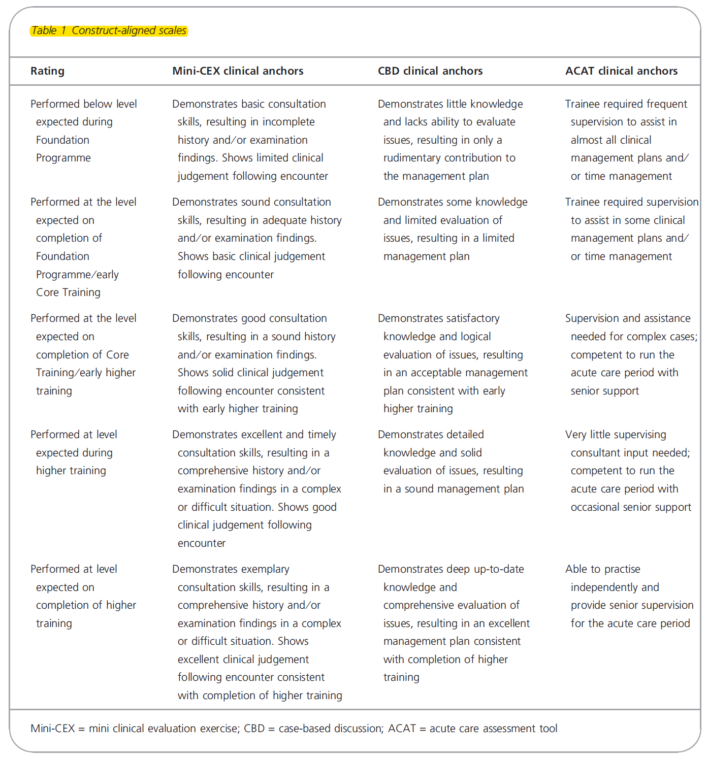 To discover if the apparent benefit of a constructaligned scale is context-specific, we chose three instruments to cover a range of assessment domains. Each instrument is already in use in the UK as part of the Joint Royal Colleges of Physicians Training Board curricula for medical trainees.19