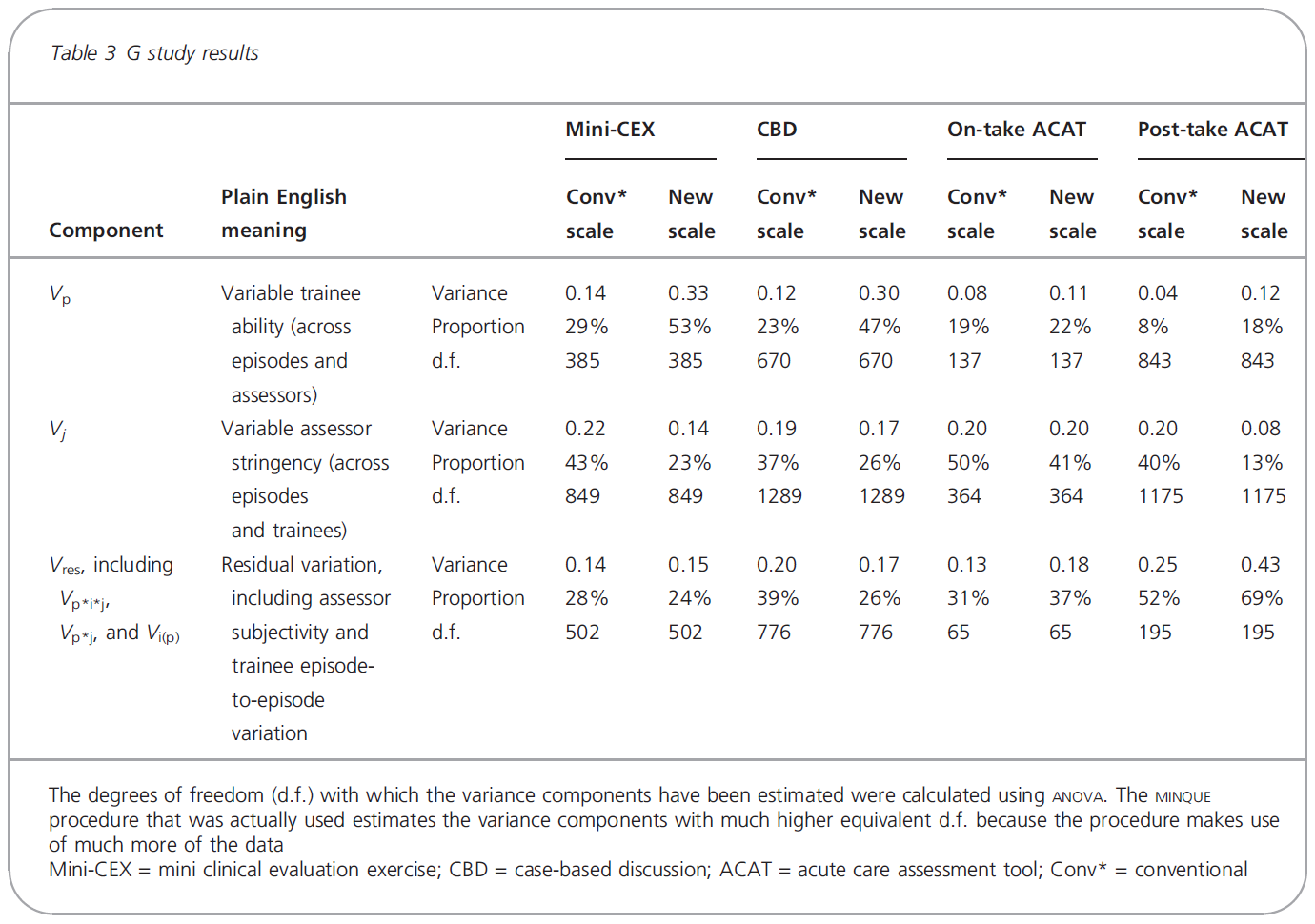 Table 3 presents the G study results, which show howmuch the raw assessment scores were influenced by the assessors’ ability to discriminate between trainees of different abilities (Vp) and by variable assessor stringency or leniency (Vj).