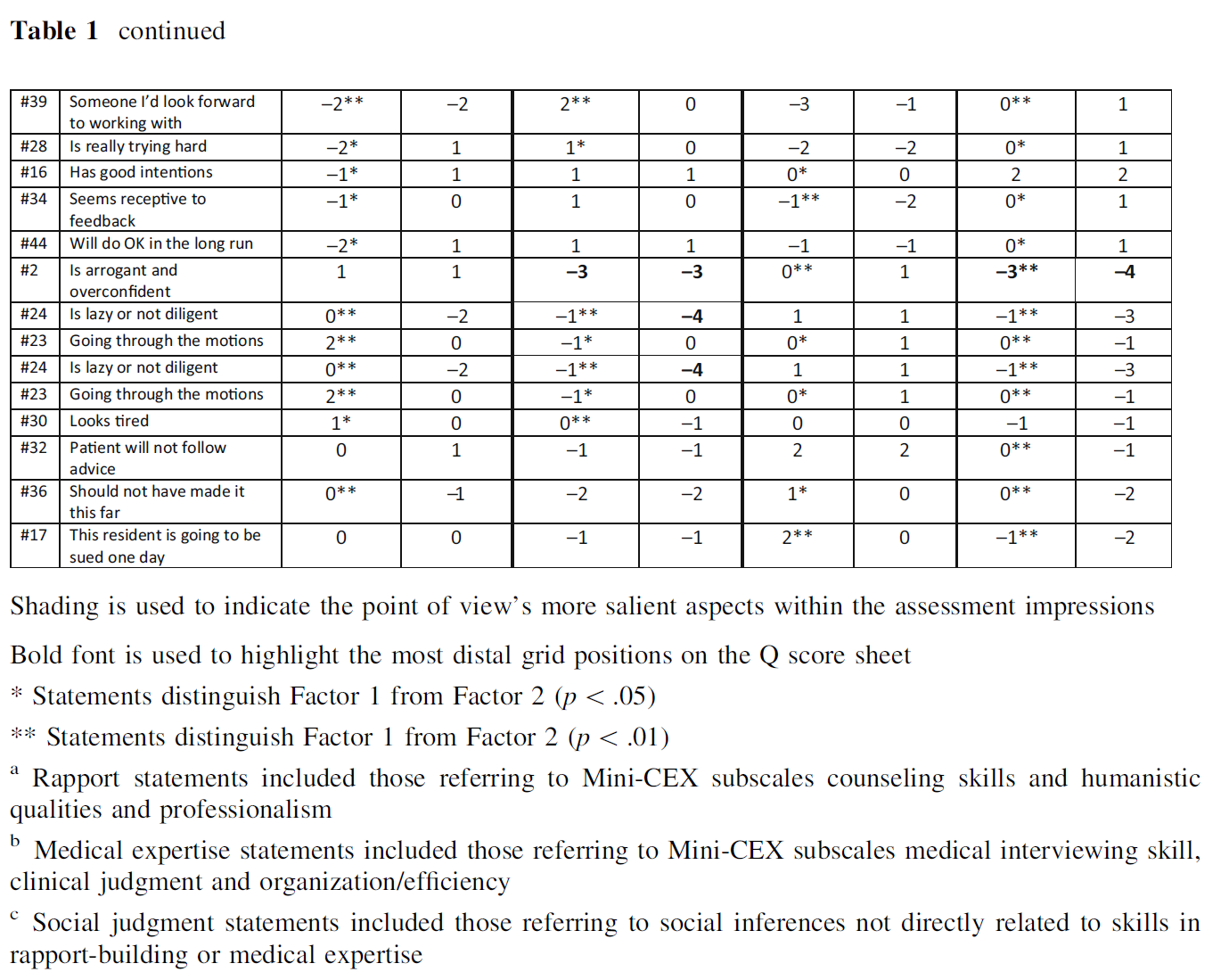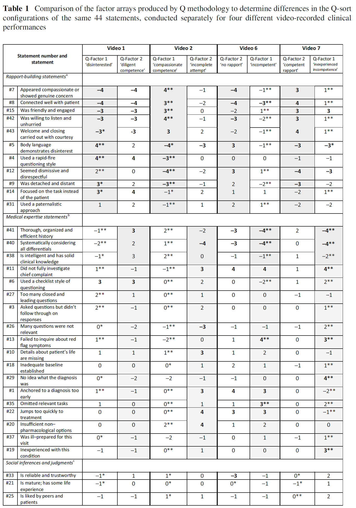 After identifying the number of points of view associated with each of the four clinical performances, we examined the configuration of the statements in the factor arrays. An interesting pattern emerged as we identified the clinical features that had been differently interpreted within each point of view. As highlighted using grey shading in Table 1, one point of view for every video (the factor listed first) used the distal position on the grid (±3 and ±4) almost exclusively to represent rapport-building statements; with the medical expertise and social judgment statements being placed in less extreme positions (0 to ±2). Conversely, the other point of viewused the distal positions almost exclusively to represent statements referring to medical expertise leaving the less extreme positions to represent the rapport building and social judgment statements. Based on these sorting configurations, it appears that for most videos, one group of physician raters emphasized rapport-building skills most prominently in their assessment impressions whereas the other group emphasized medical expertise skills as most salient.