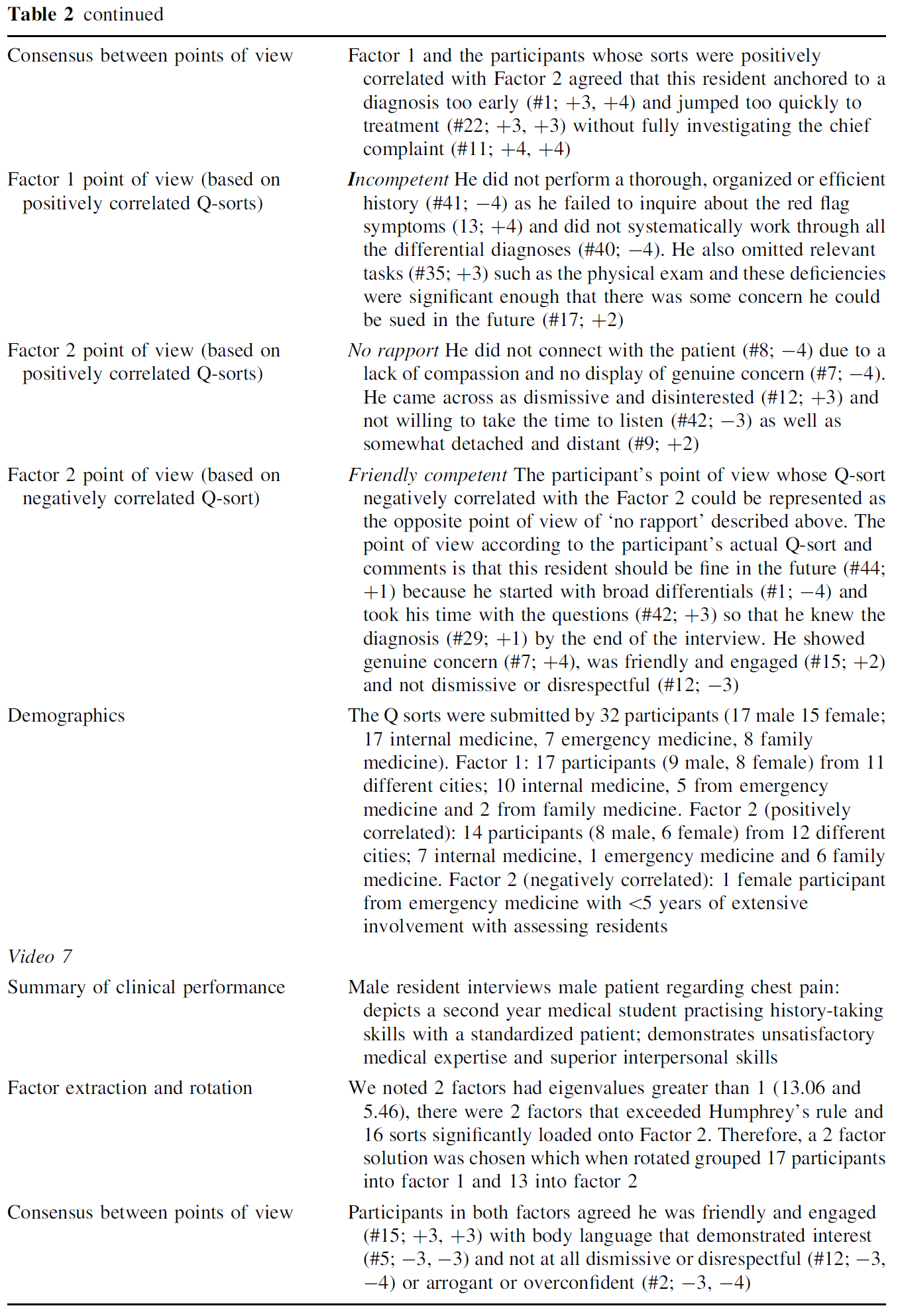 Similar interpretations can be found for each of the various perspectives on each video in Table 2. The distinction between the two perspectives was more striking for some videos (e.g. video 2 and 7) and less so for others (e.g. video 1 and positively correlated points of view for video 6). For example, there is much more agreement across the points of view for Video 1 in emphasizing deficient rapport building. However, for all four clinical performances the content of the assessment judgments was sufficiently different as to be identifiable as distinct points of view despite some instances of agreement between them. Examination of physician membership within these points of view revealed that membership was not stable across the four performances (i.e. it was not the same group of physicians emphasizing rapport-building skills over medical expertise every time) and membership could not be attributed to demographic factors (as shown in Table 2).